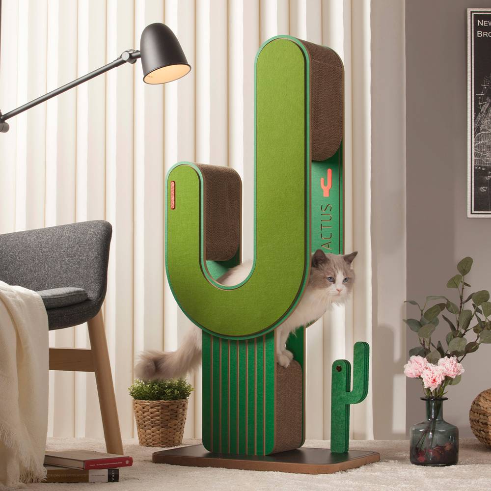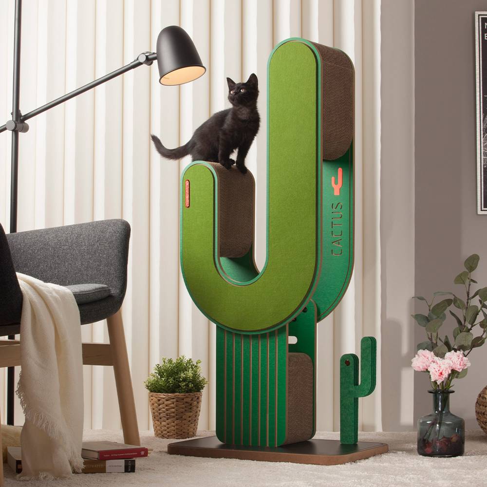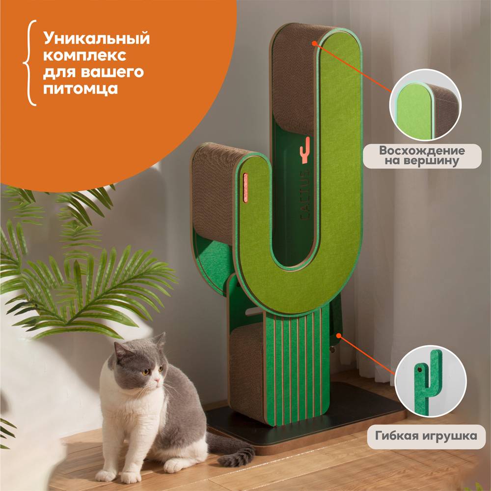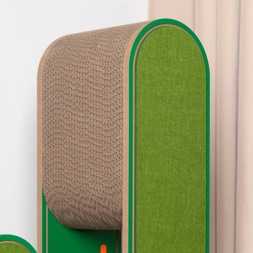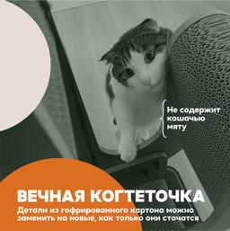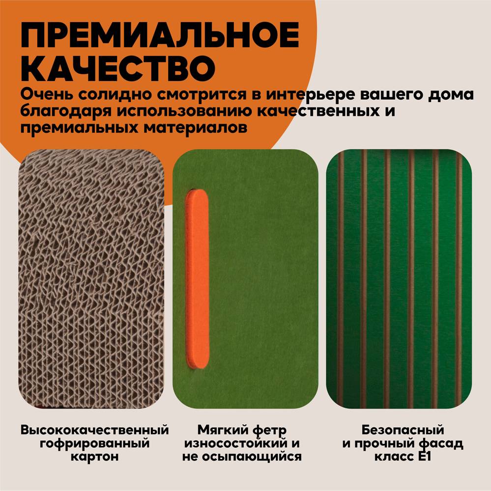 Очень солидно смотрится в интерьере вашего дома благодаря использованию качественных и премиальных материалов: высококачественный гофрированный картон, мягкий фетр износостойкий и не осыпающийся, безопасный и прочный фасад МДФ класс Е1. Не содержит в составе кошачью мяту.