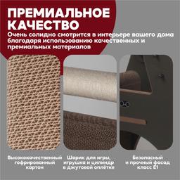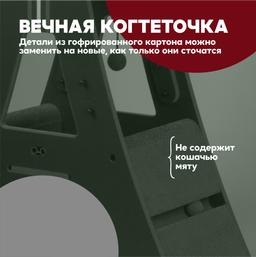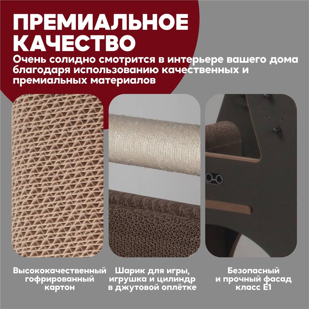 - Округлые безопасные элементы с просчитанным утяжелением конструкции делают когтеточку надёжной даже для самых больших котов и кошек! Очень солидно смотрится в интерьере вашего дома благодаря использованию качественных и премиальных материалов: высококачественный гофрированный картон, безопасный и прочный фасад МДФ класс Е1.