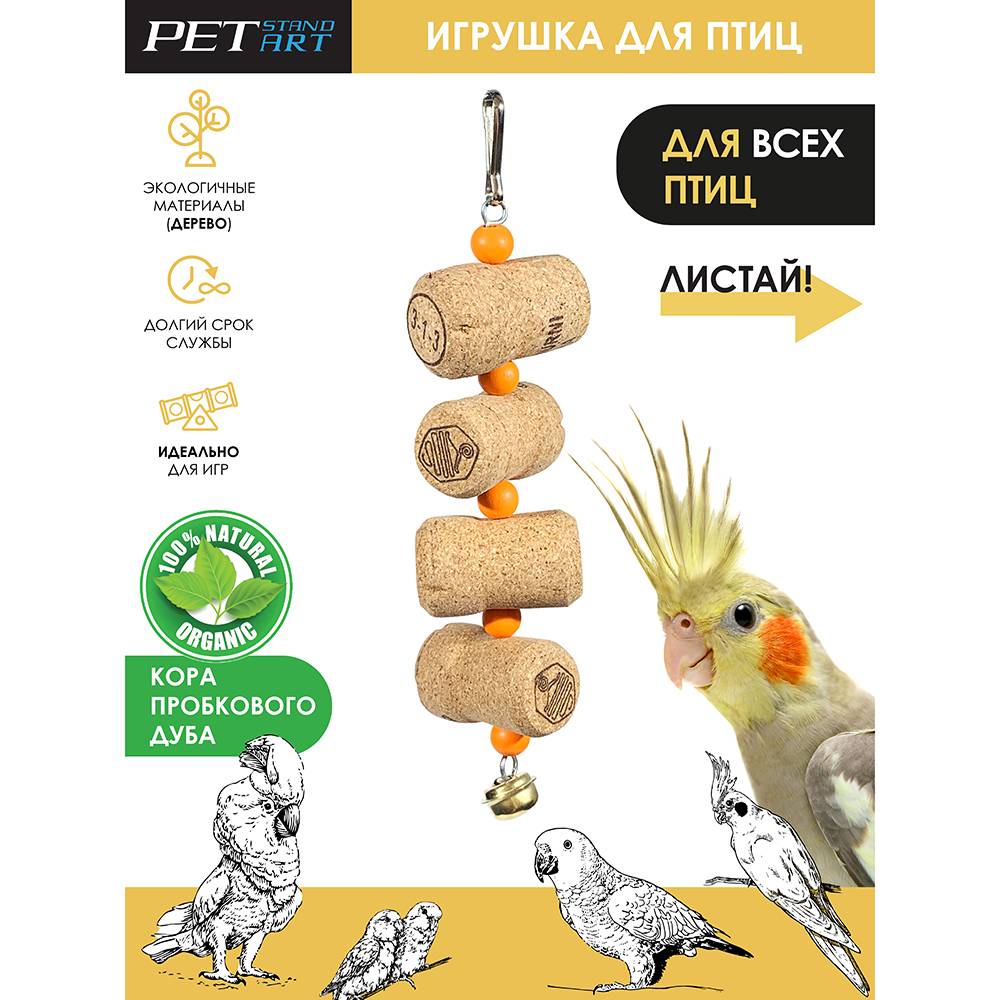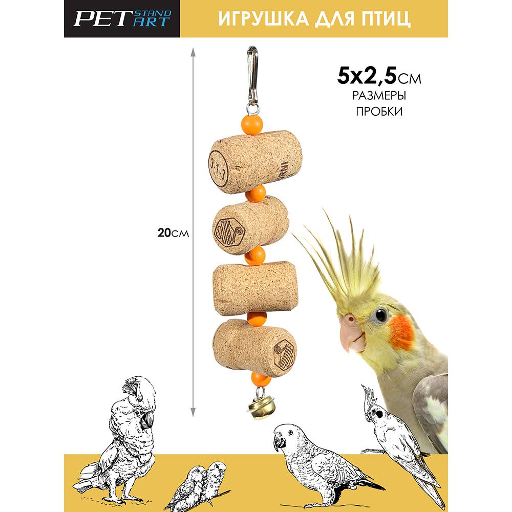 Подвес из пробок с бубенцом, который так весело звенит. Каждая игрушка для попугая создается вручную из натуральных материалов. Игрушка подходит для средних: для корелл, для какариков, для неразлучников, для жако и других птиц аналогичного размера.