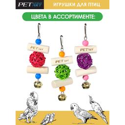 Яркая подвесная игрушка для попугаев с колокольчиком от PetStandArt поднимет настроение, развлечет, приведет в настоящий восторг питомца. В игрушке стоит отметить прочный карабин и натуральные материалы: деревянные бусины и брусочки с ротанговым шариком. Все игрушки сделаны без использования клея, поэтому птичка может безопасно клевать и наслаждаться игрой в отсутствие хозяина. Каждая игрушка для попугая создается вручную из натуральных материалов с использованием пищевых красителей. Игрушка подходит для мелких птиц: для волнистых попугайчиков, для зябликов, для канареек, для корелл и других птиц аналогичного размера. Цвет: ассорти.