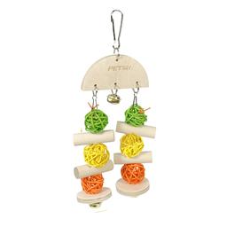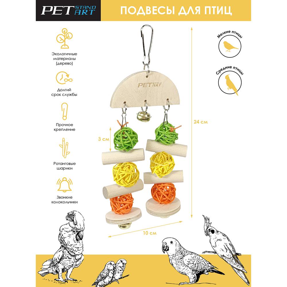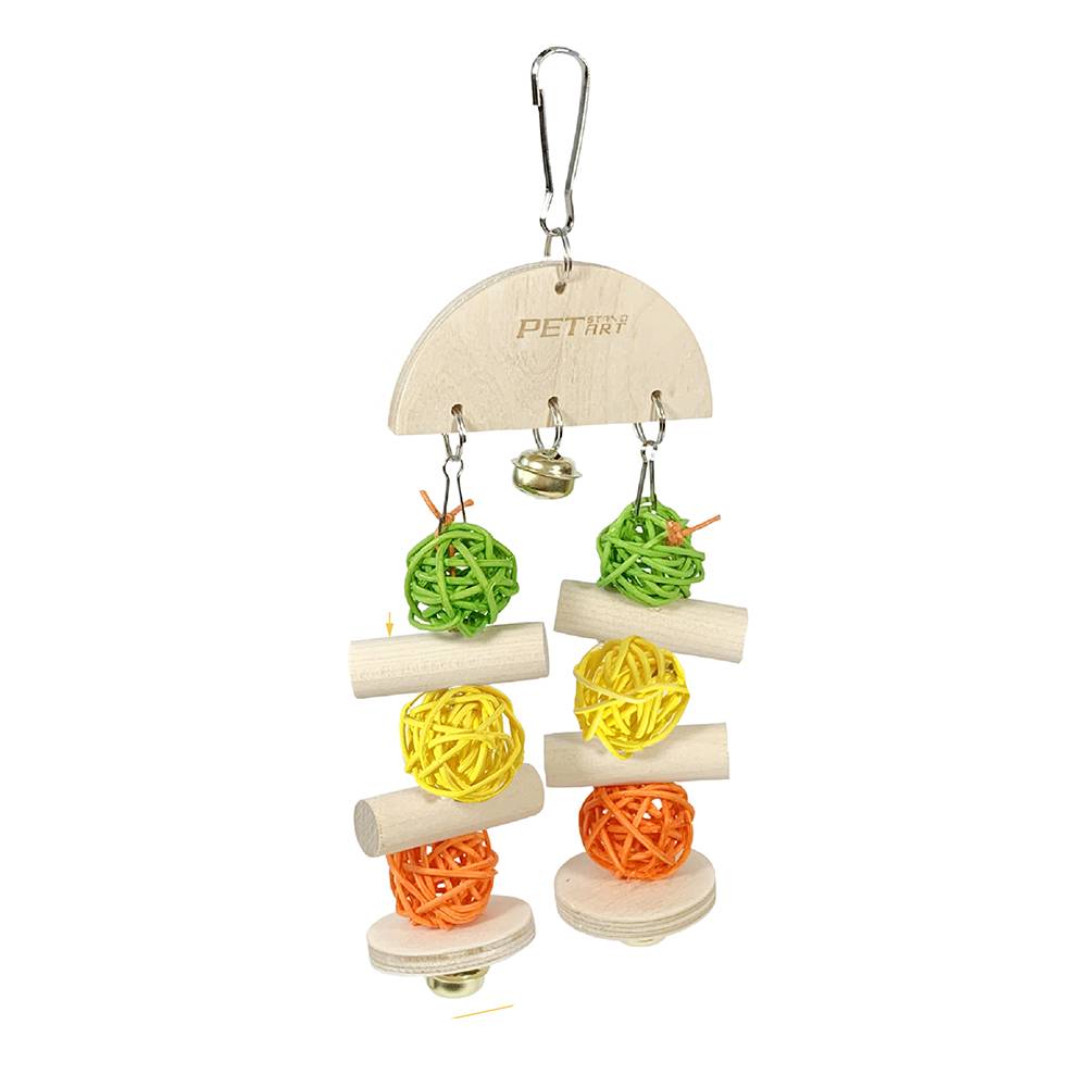 Яркая подвесная игрушка для птиц с колокольчиком от PetStandArt поднимет настроение, развлечет, приведет в настоящий восторг питомца. Подвес игрушка с колокольчиком состоит из прочного карабина, ротанговых шаров, чередующихся с деревянными брусками, дополнена звонкими колокольчиками. Шарики из ротанга без клея, поэтому птичка может безопасно жевать веточки. Каждая игрушка для попугая создается вручную из натуральных материалов с использованием пищевых красителей. Игрушка подходит для мелких птиц: для волнистых попугайчиков, для зябликов, для канареек, для корелл и других птиц аналогичного размера.