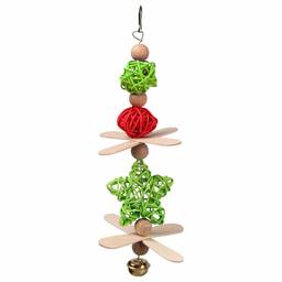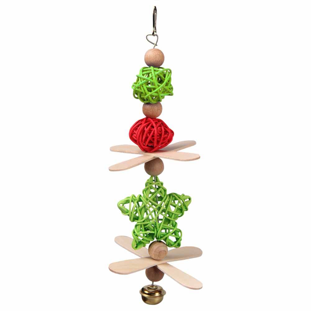 - Подвес состоит из прочного карабина, 3 ярких, ротанговых фигур, чередующихся с деревянными бусинами и лопастями, дополнен звонким колокольчиком.