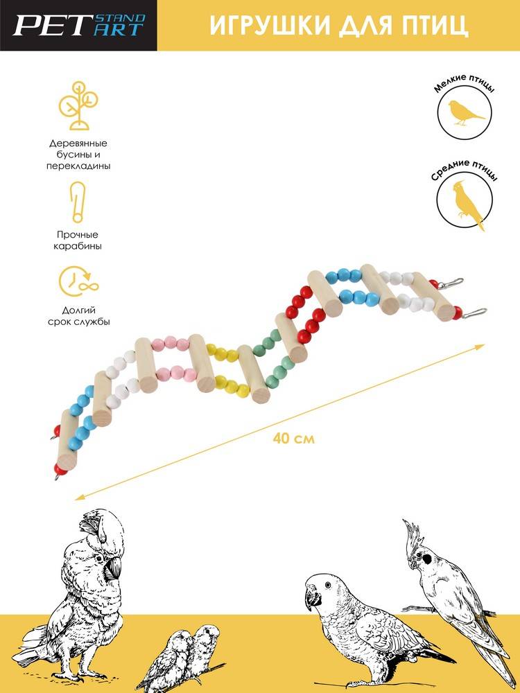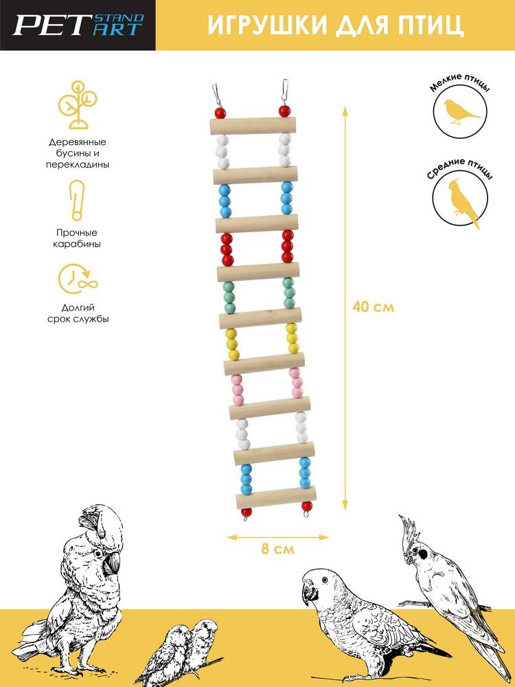 Яркая, подвесная лестница для попугаев и грызунов из 9 ступеней поднимет настроение Вашему питомцу, развлечет и повысит двигательную активность. Лестница крепится за 4 прочных железных карабина.