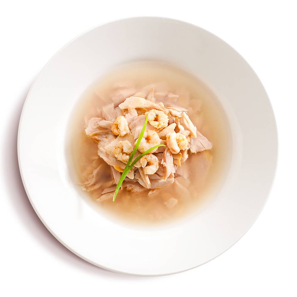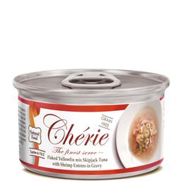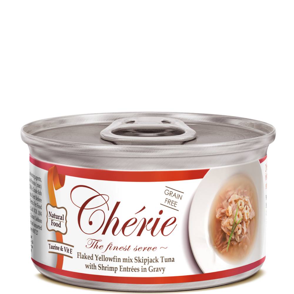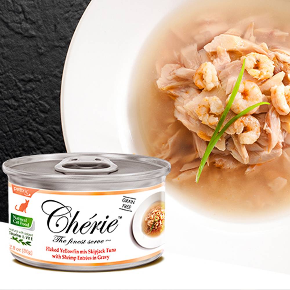 Pettric Cherie Signature gravy, тунец, креветки, 80 гр. Роскошная смесь больших хлопьев желтоперого тунца с цельными креветками в насыщенной подливе для ваших любимых кошек. Благодаря натуральному вкусу и фирменному соусу Chérie, это настоящая кошачья сенсация!