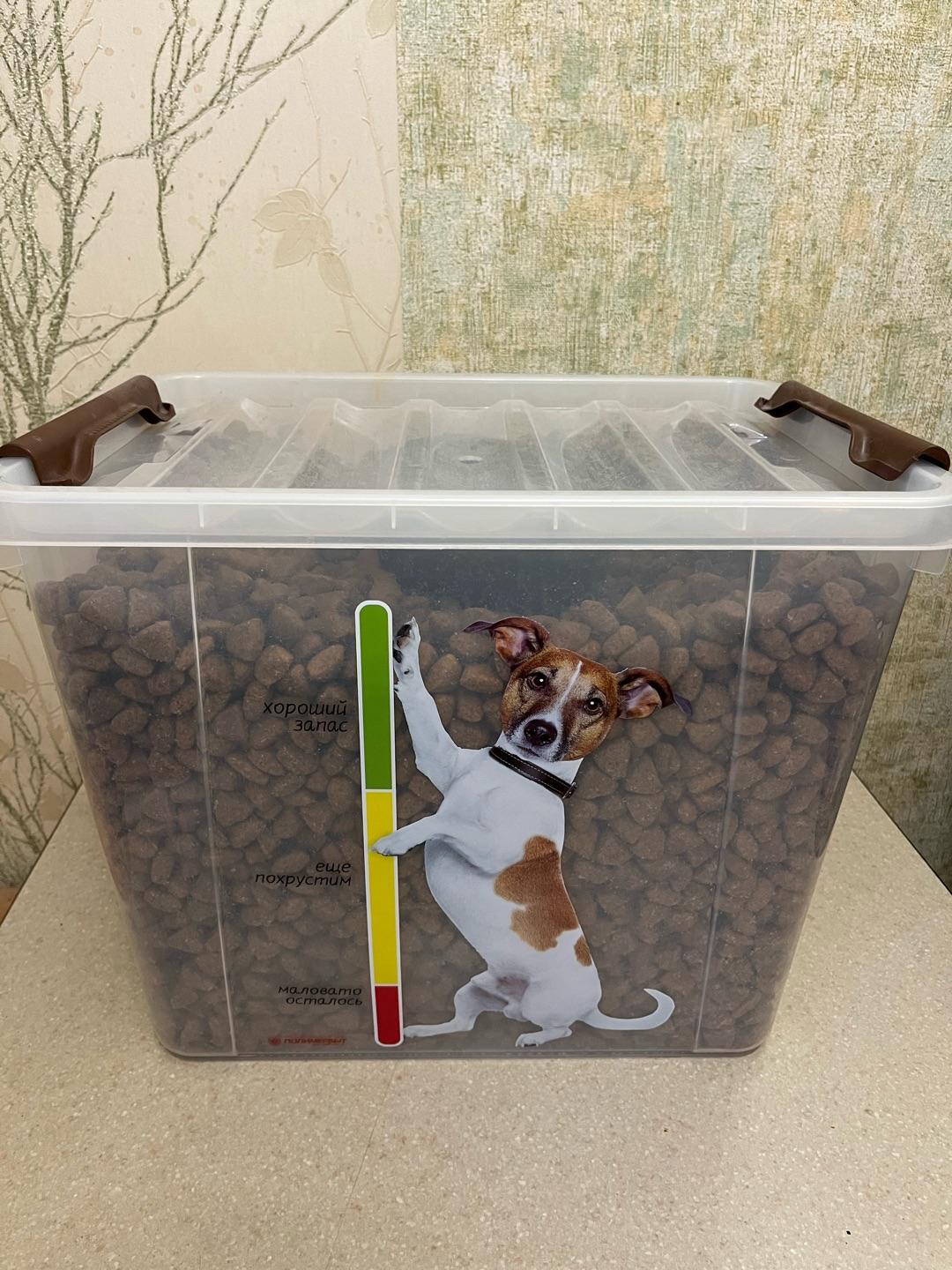 - Контейнер, изготовленный из высококачественного пластика, предназначен для хранения корма для животных.