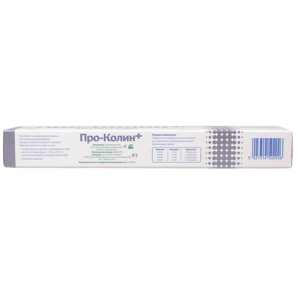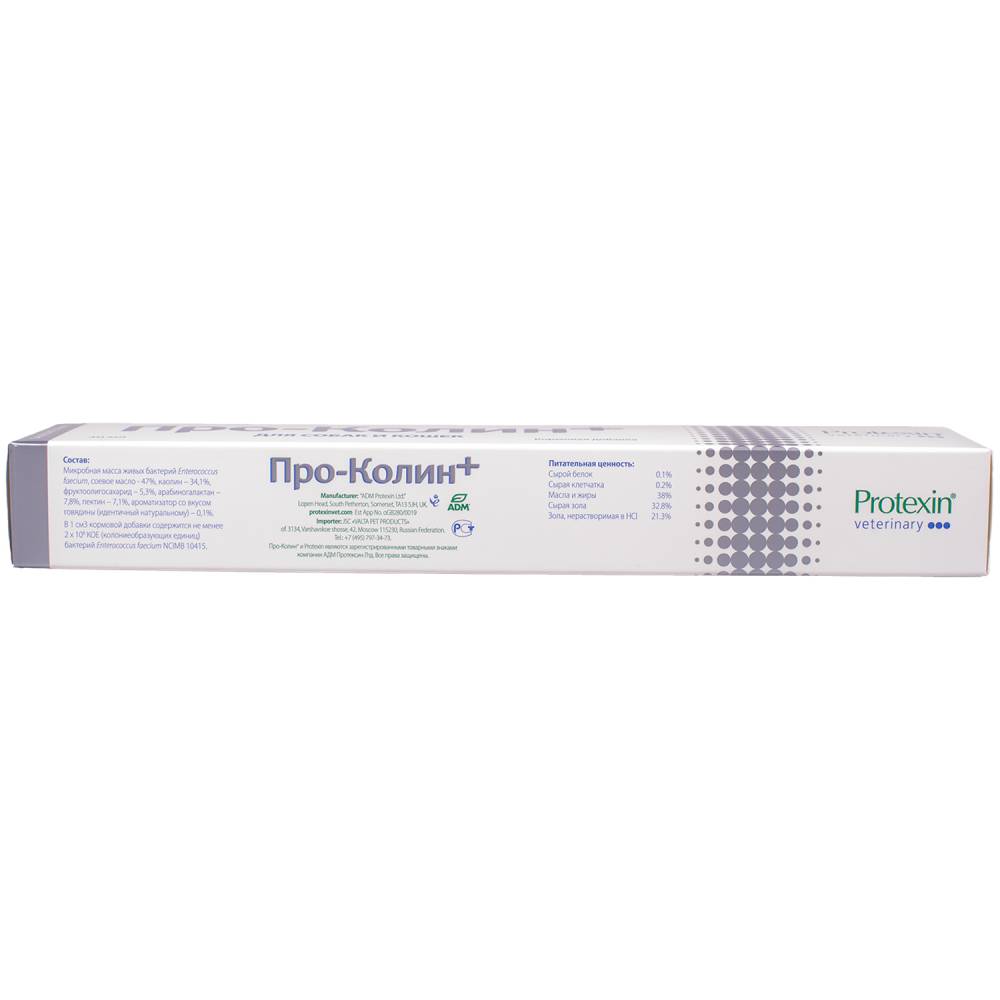 Про-Колин+® – пробиотическая кормовая добавка для нормализации микрофлоры желудочно-кишечного тракта и стимуляции обменных процессов у собак и кошек.