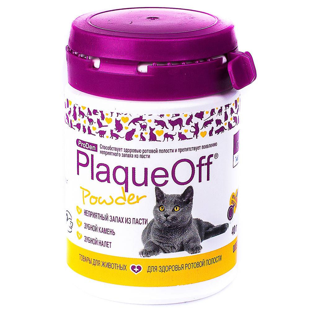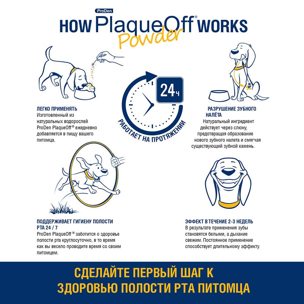 Наличие кальция и фосфора в слюне обеспечивает поддержание постоянства состава тканей зуба. Высокое содержание кальция и фосфора в слюне: препятствует растворению эмали, обеспечивает поступление ионов кальция и фосфора в эмаль. Постоянное использование ProDen PlaqueOff Powder профилактирует образование зубного налета, камня и неприятного запаха изо рта у собак и кошек.