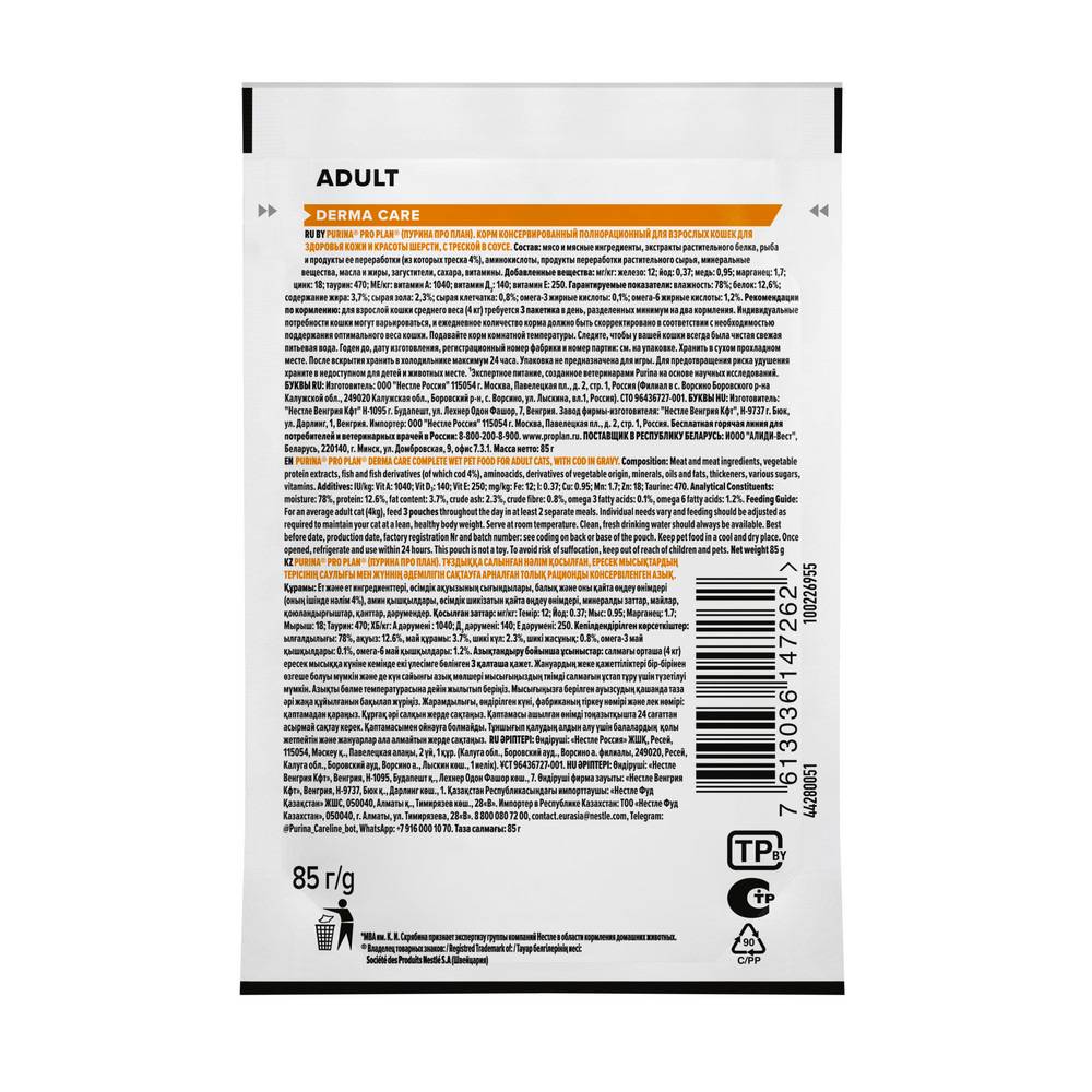 Влажный корм для кошек PURINA® PRO PLAN® DERMA CARE (Забота о здоровье кожи и шерсти) — это полюбившийся PRO PLAN® NUTRISAVOUR® ELEGANT с новым названием, но с прежним составом и качеством.