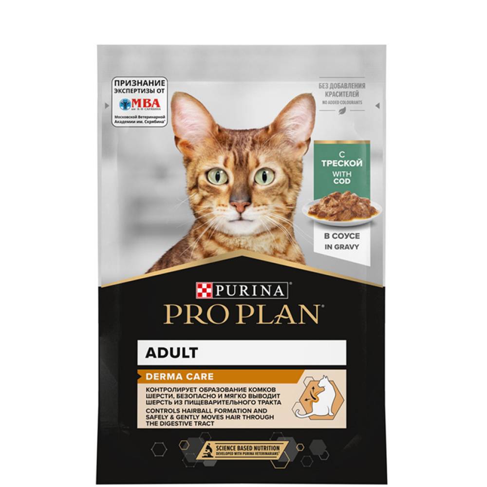 Команда квалифицированных ветеринарных специалистов разработала влажный корм PURINA® PRO PLAN® DERMA CARE для здоровья кожи и красоты шерсти. Этот полнорационный корм для кошек с треской легко усваивается, а его специально подобранный состав помогает нормализовать состояние кожи и вернуть природную красоту шерсти.