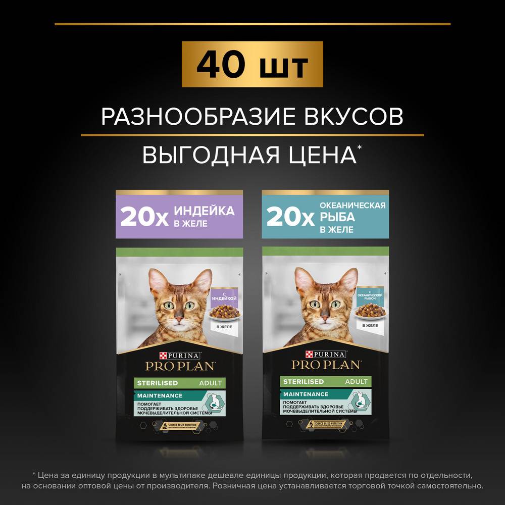 Стерилизация способствует увеличению продолжительности жизни и снижает риски возникновения многих заболеваний. Однако стерилизованные кошки имеют свои особенности. После стерилизации кошка становится менее активной, в результате чего повышается склонность к набору веса и развитию мочекаменной болезни. Эксперты PRO PLAN разработали влажный корм для стерилизованных кошек с учетом особых потребностей Вашего питомца.