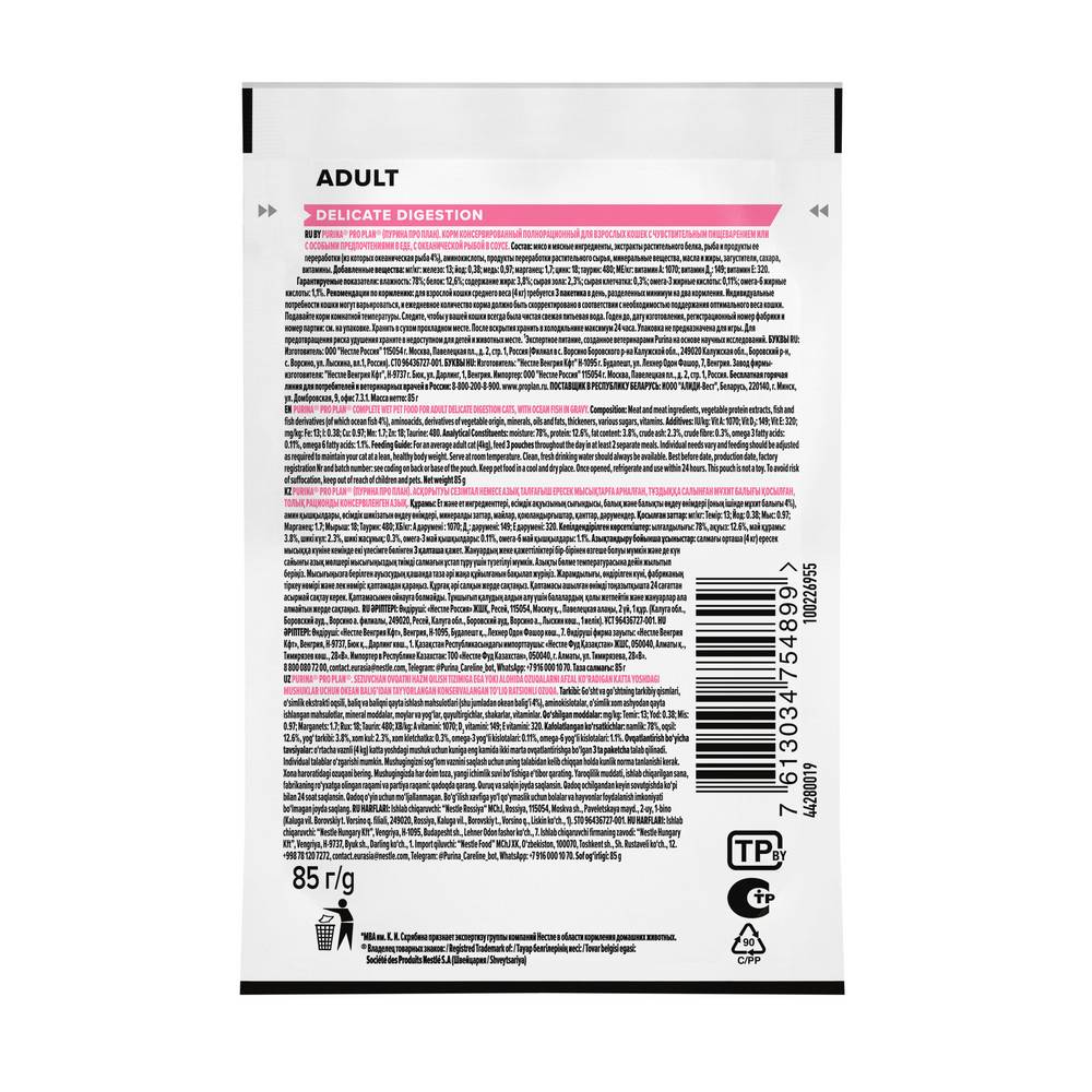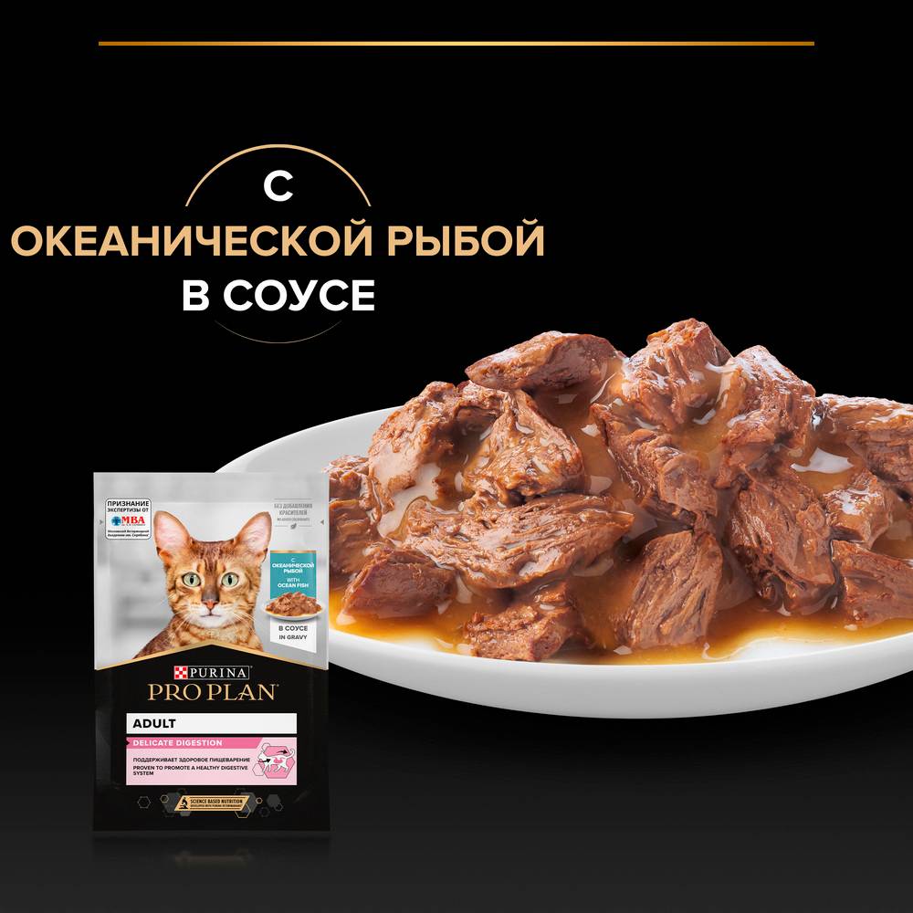Команда квалифицированных ветеринарных специалистов разработала влажный корм PURINA® PRO PLAN® DELICATE DIGESTION для взрослых кошек с чувствительным пищеварением. Этот полнорационный корм для кошек с океанической рыбой легко усваивается и подходит для повседневного кормления питомцев с проблемами пищеварения.