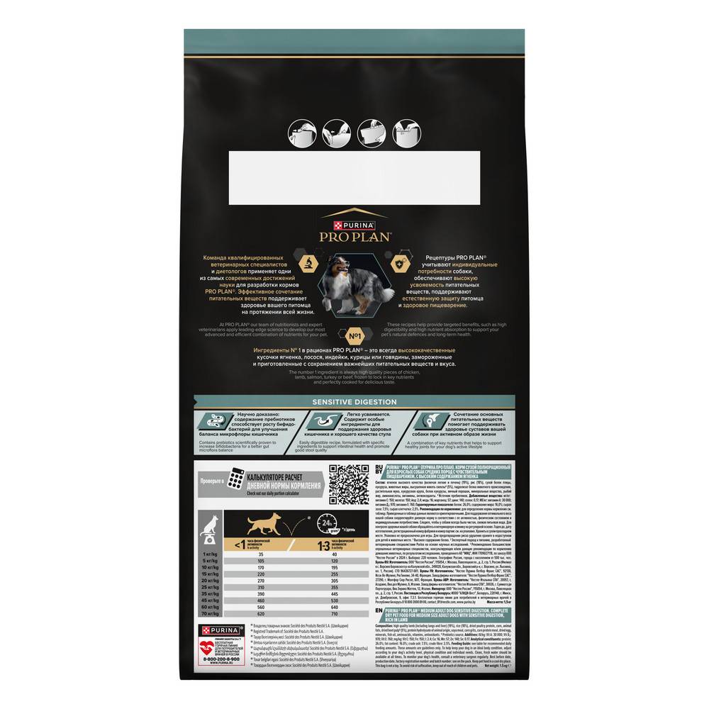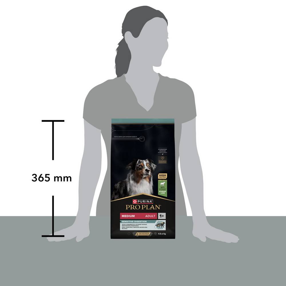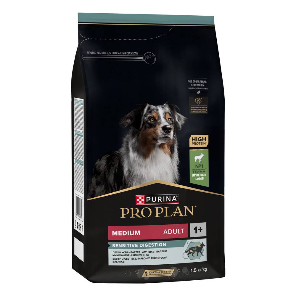 Изучая потребности собак на протяжении многих лет, команда квалифицированных ветеринарных специалистов и диетологов PURINA разработала сухой корм PRO PLAN® Sensitive digestion (для чувствительного пищеварения) — ежедневный рацион с высоким содержанием ягненка для взрослых собак средних пород. Этот полнорационный корм сбалансирован по составу и помогает поддержать здоровое пищеварение.