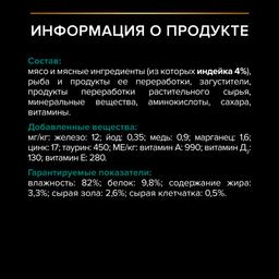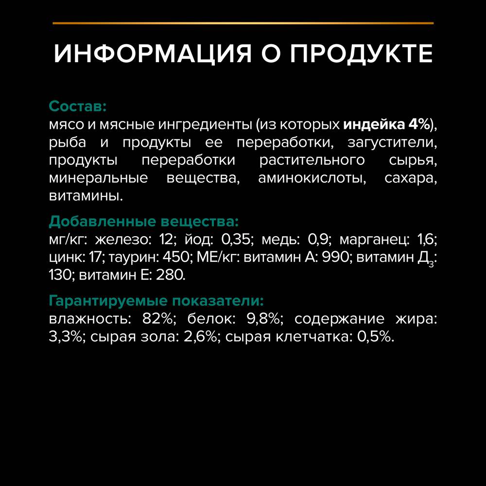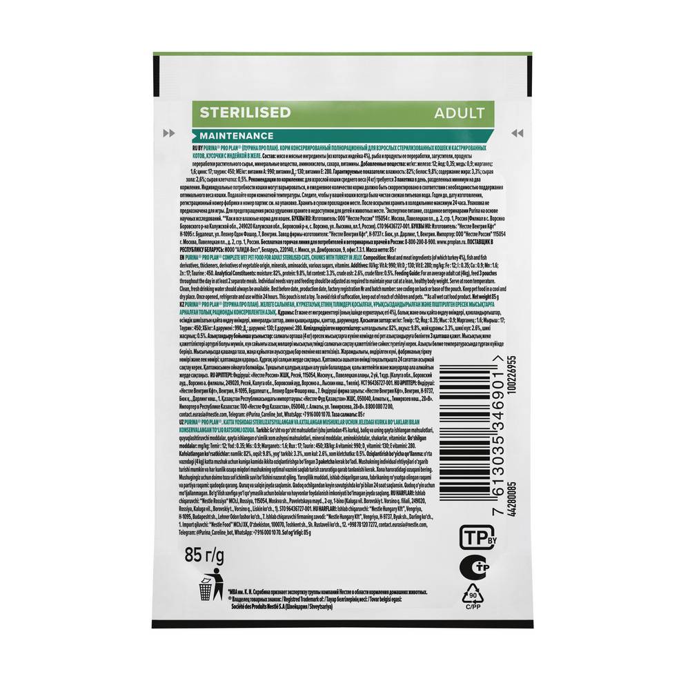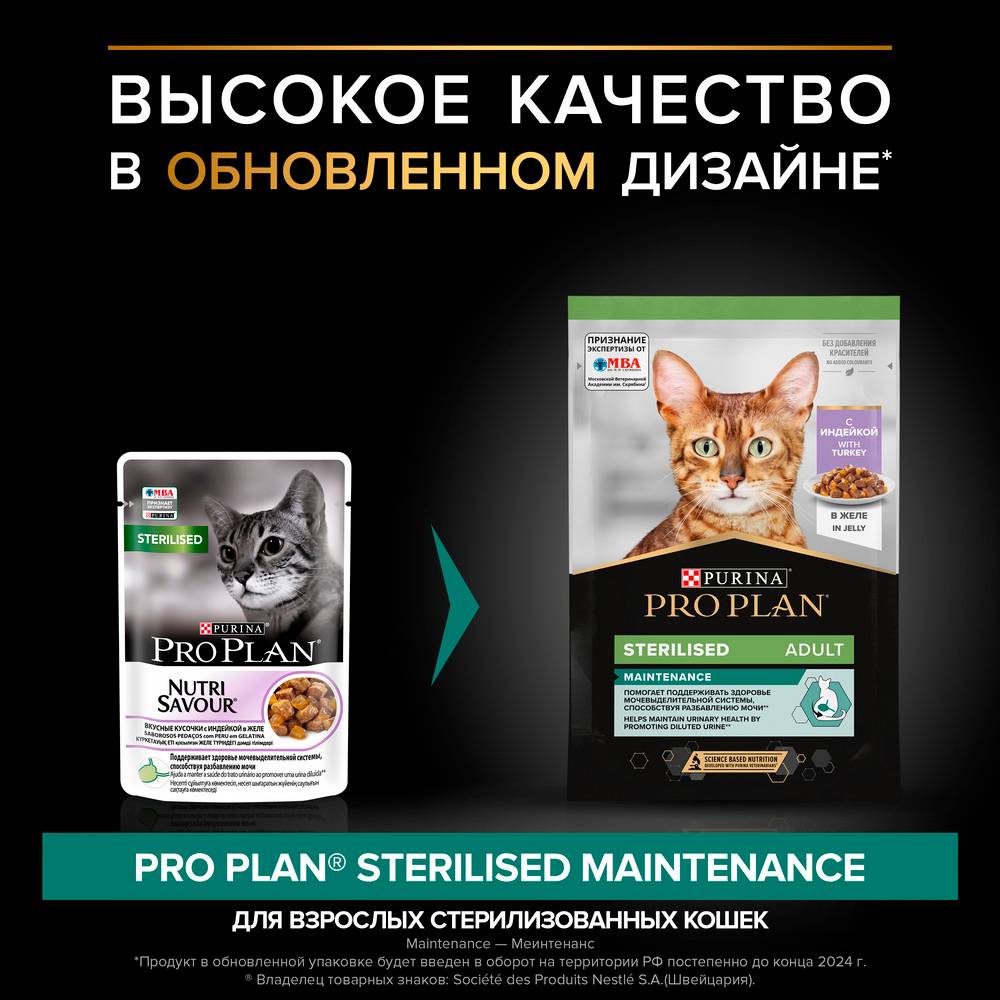 Команда квалифицированных ветеринарных специалистов разработала влажный корм PURINA® PRO PLAN® Adult STERILISED MAINTENANCE для взрослых стерилизованных кошек. Этот полнорационный корм для кошек с индейкой подходит для ежедневного кормления и полностью отвечает индивидуальным потребностям организма стерилизованных питомцев.