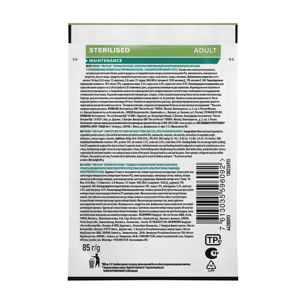 Команда квалифицированных ветеринарных специалистов разработала влажный корм PURINA® PRO PLAN® STERILISED MAINTENANCE для взрослых стерилизованных кошек. Этот полнорационный корм для кошек с океанической рыбой подходит для ежедневного кормления и полностью удовлетворяет индивидуальные потребности организма стерилизованных питомцев.