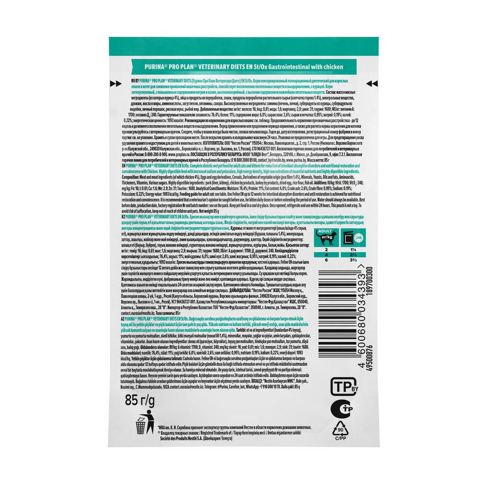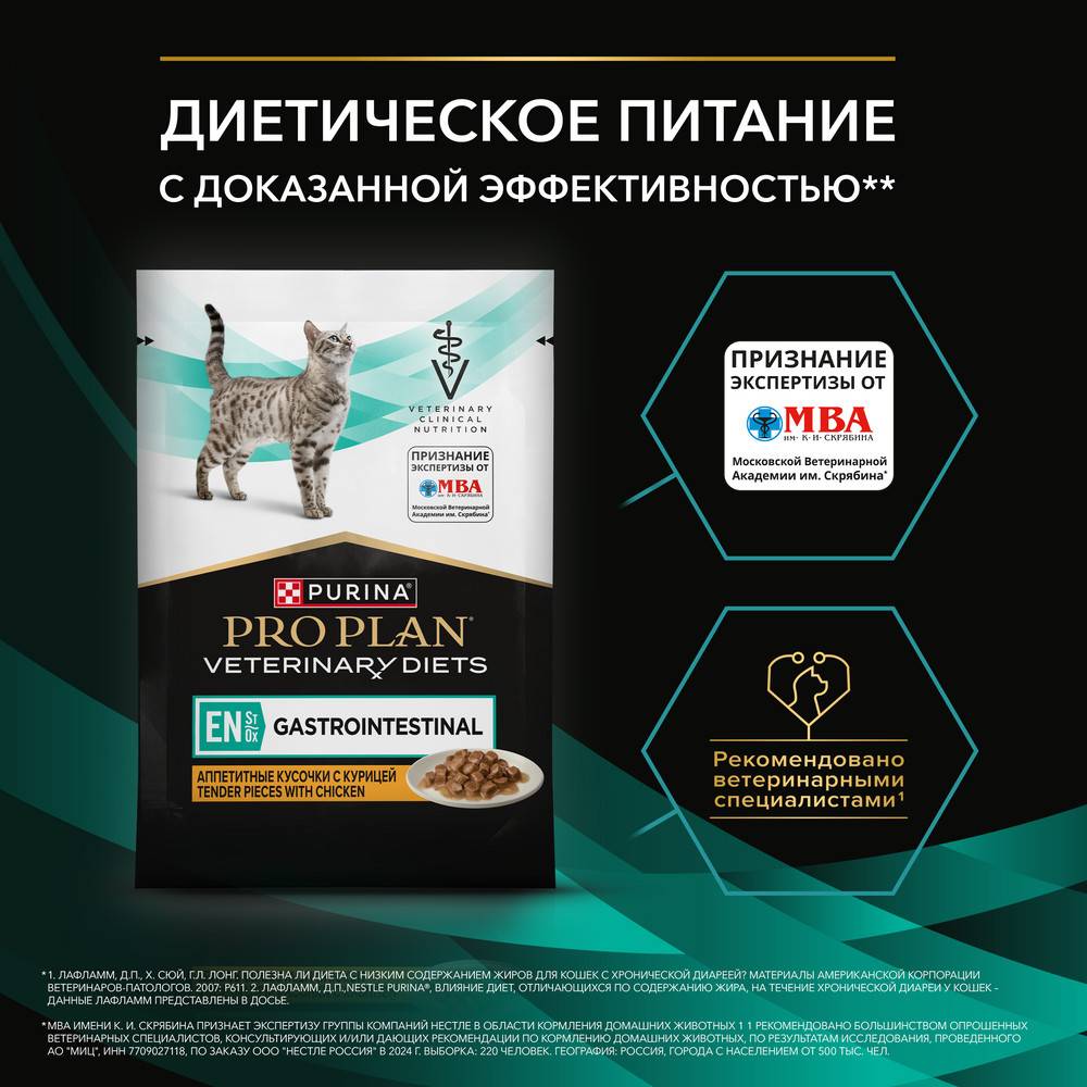 Команда квалифицированных ветеринарных специалистов и диетологов разработала полнорационный диетический корм PRO PLAN® VETERINARY DIETS (Про План Ветеринари Даетс) EN St/Ox Gastrointestinal, для снижения проявлений кишечных расстройств, который подходит как для взрослых кошек, так и для котят. Корм для кошек с расстройствами ЖКТ способствует восполнению питательных веществ и выздоровлению.