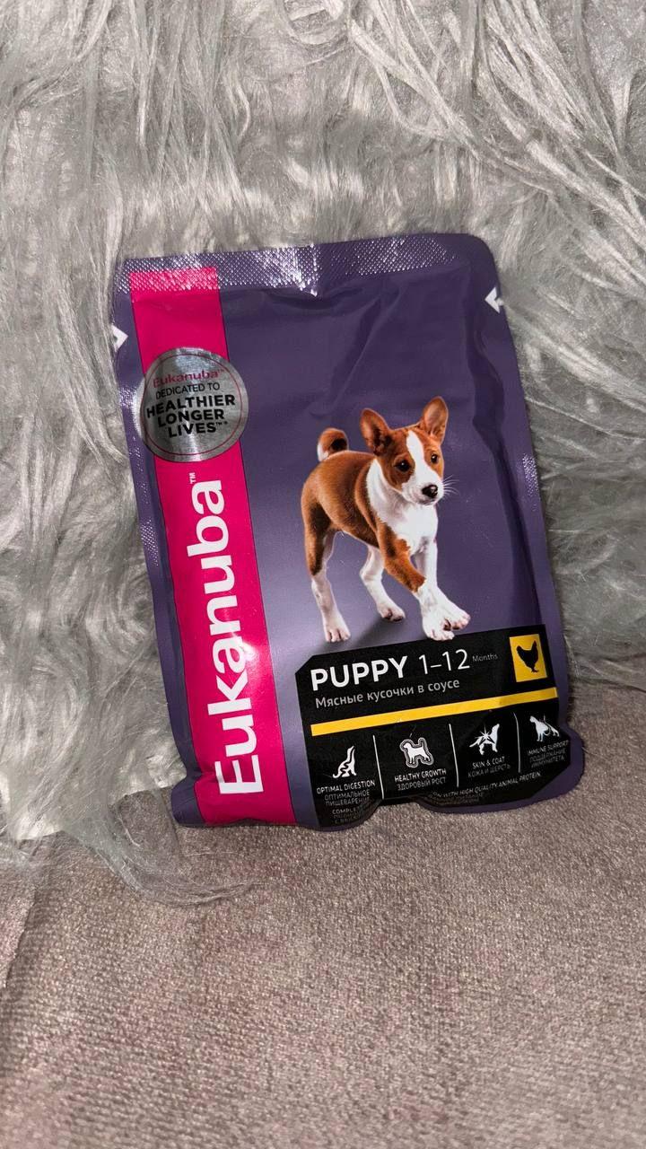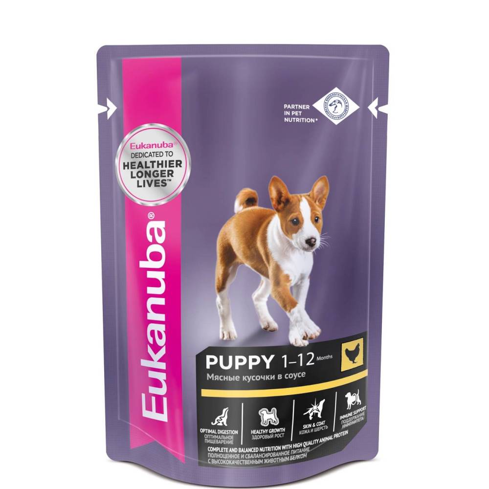 Влажный рацион с курицей в соусе. Полноценное и сбалансированное питание для щенков всех пород в возрасте от 1 до 12 месяцев с высококачественным животным белком.
