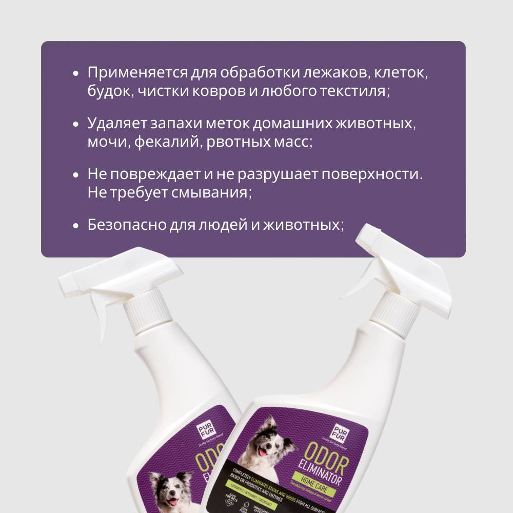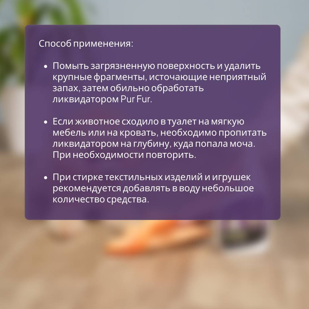 - Помыть загрязненную поверхность и удалить крупные фрагменты, источающие неприятный запах, затем обильно обработать ликвидатором Pur Fur.