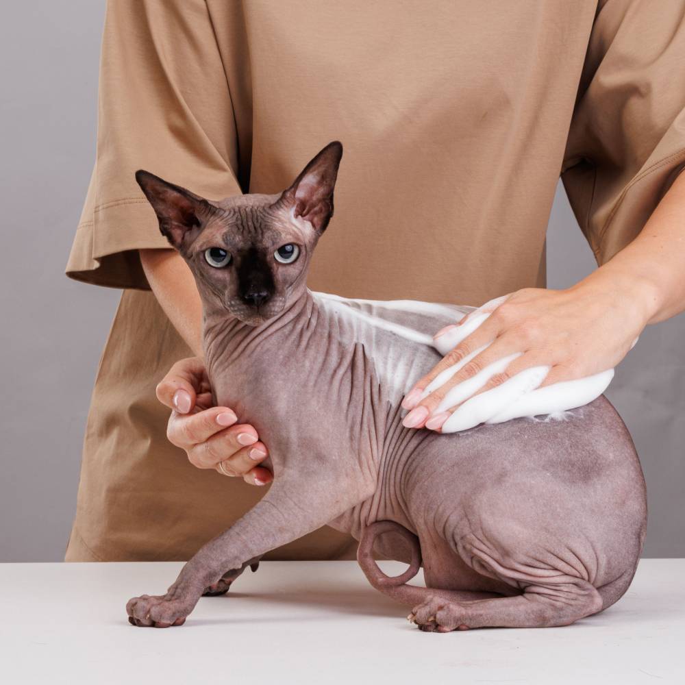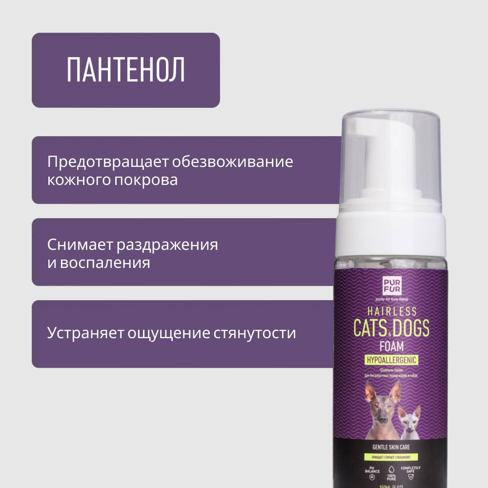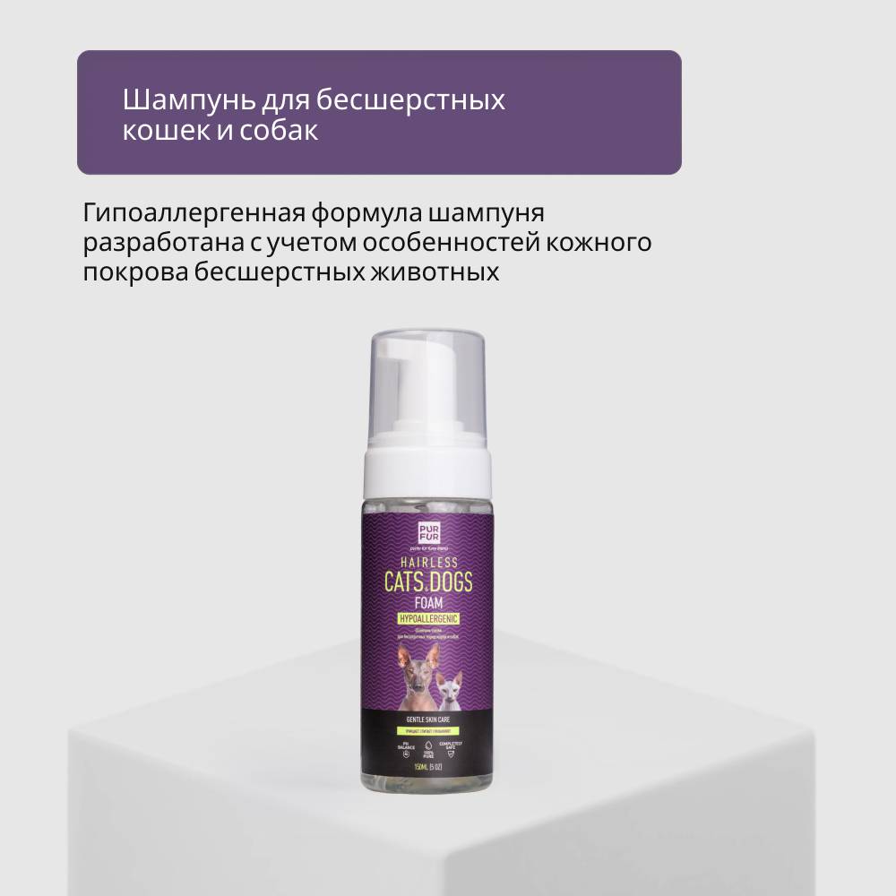 Шампунь для бесшерстных кошек и собак от бренда Pur Fur разработан с учетом особенностей кожного покрова таких питомцев. Сбалансированный pH и входящие в состав компоненты бережно очищают и увлажняют кожу домашнего любимца. С шампунем-пенкой Pur Fur гигиенический уход будет простым и эффективным.