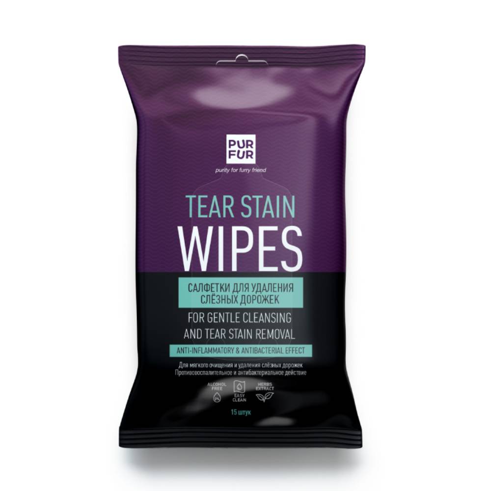 Влажные салфетки PurFur - первый помощник в гигиеническом уходе за питомцем. Салфетки удаляют слезные дорожки и пятна с шерсти вокруг глаз у собак и кошек (не отбеливают, а возвращают первоначальный цвет шерсти). Появление темных, непривлекательных пятен под глазами у питомцев вызвано слезоотделением, особенно заметны эти пятна у животных светлых окрасов. Мощная, но очень нежная формула эффективно очищает шерсть вокруг глаз, не вызывая раздражения. Ежедневная чистка слезных дорожек способствует уменьшению повторного образования пятен в этих областях и тонизирует кожу.