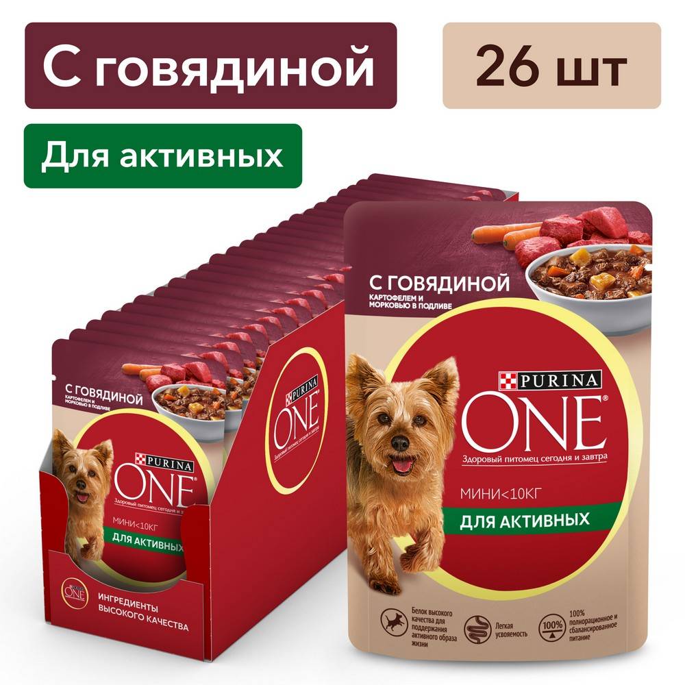 - Влажный корм для собак Purina One сочетает в себе мягкие кусочки и овощи с аппетитной подливой, что увеличивает его вкусовую привлекательность.