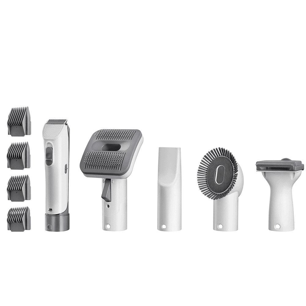 - Многофункциональность. Груминг-станция GS50 объединяет четыре режима работы: груминг, стрижка, сушка и пылесос. Для этого в комплект входят 5 насадок: щетка для линьки, щетка для шерсти, плоская насадка-концентратор, портативный триммер, бытовая насадка для удаления шерсти. Это позволяет проводить комплексный уход за питомцем без необходимости использовать несколько устройств.