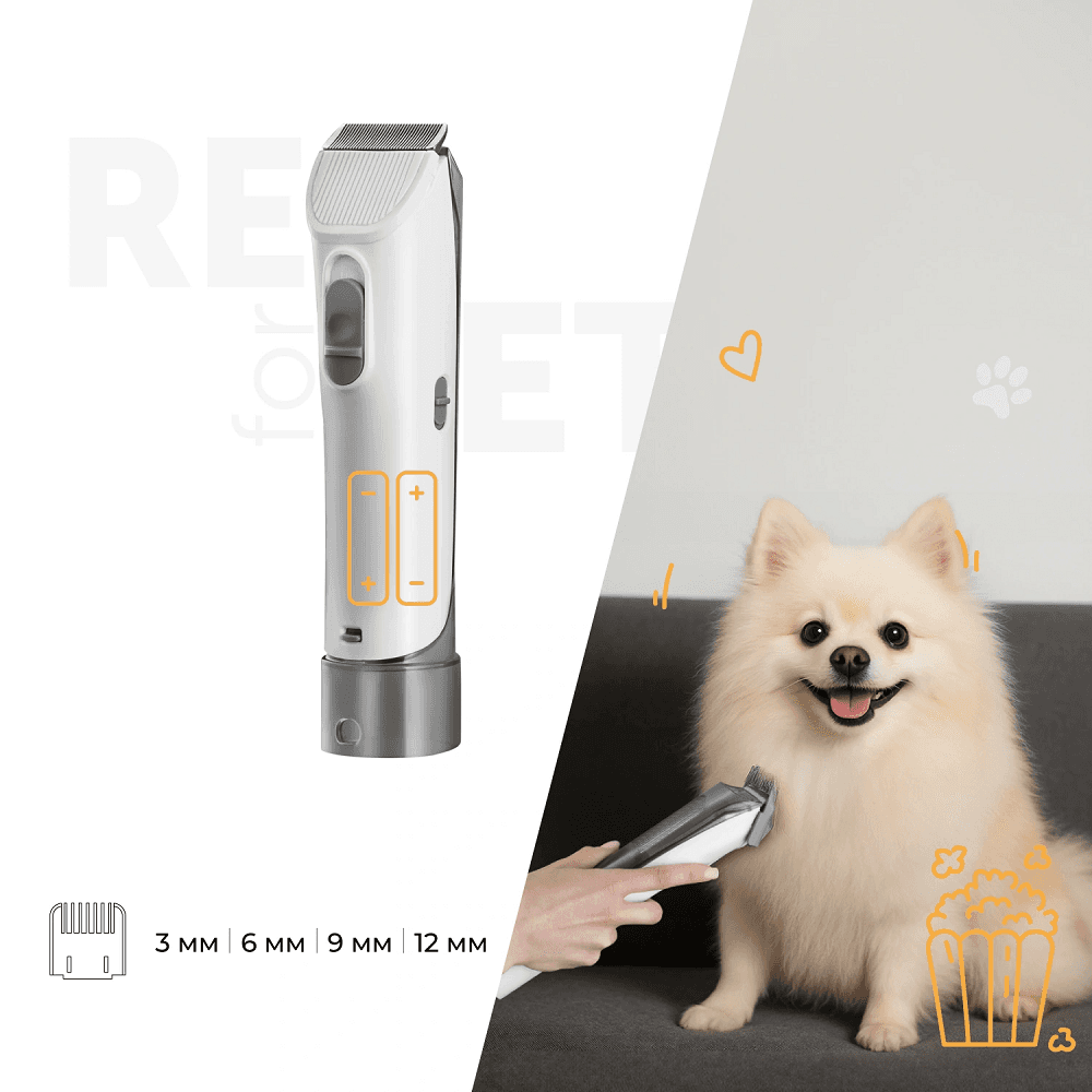- Триммер с автономным питанием. Встроенный триммер работает от батареек AA и оснащен 4 насадками (3, 6, 9, 12 мм) для точной стрижки шерсти разной длины. Подключение к шлангу станции позволяет сразу удалять подстриженную шерсть.
