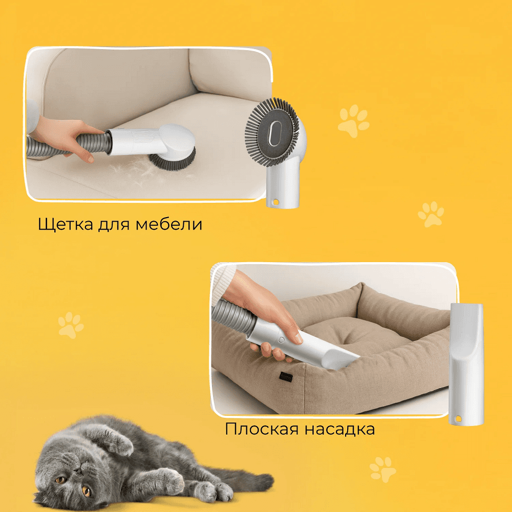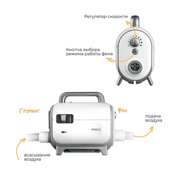 - Низкий уровень шума. Уровень шума при работе устройства в режимах фена или пылесоса не превышает 64 Дб. Это позволяет дополнительно снизить стресс животного во время гигиенических процедур.
