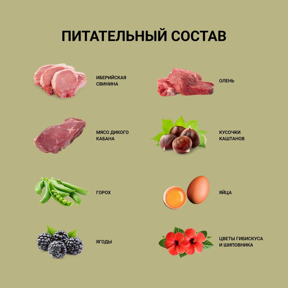 - Состав корма сбалансирован в соотношении 70% ингредиентов животного происхождения и 30% растительных ингредиентов, таких как гибискус, шиповник и горох.