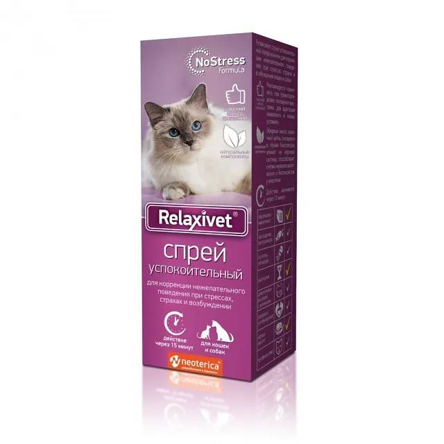 Релаксивет спрей успокоительный предназначен для коррекции нежелательного поведения при стрессах, страхах и возбуждении у кошек и собак.