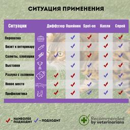 Порядок применения: перед применением необходимо встряхнуть флакон, затем распылить спрей (5–10 нажатий) в местах, где животное почувствовало беспокойство, а также на переноску во время транспортировки.