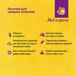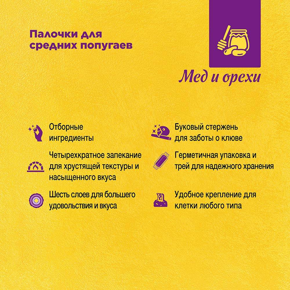 Палочки для средних попугаев с медом и орехами содержат отборные ингредиенты и помогают разнообразить рацион питомца. Для хрустящей консистенции палочки выпекаются в печах по технологии бережного запекания, которая сохраняет все полезные свойства продукта. Основа лакомства – буковый стержень, который служит отличным инструментом для стачивания клюва.