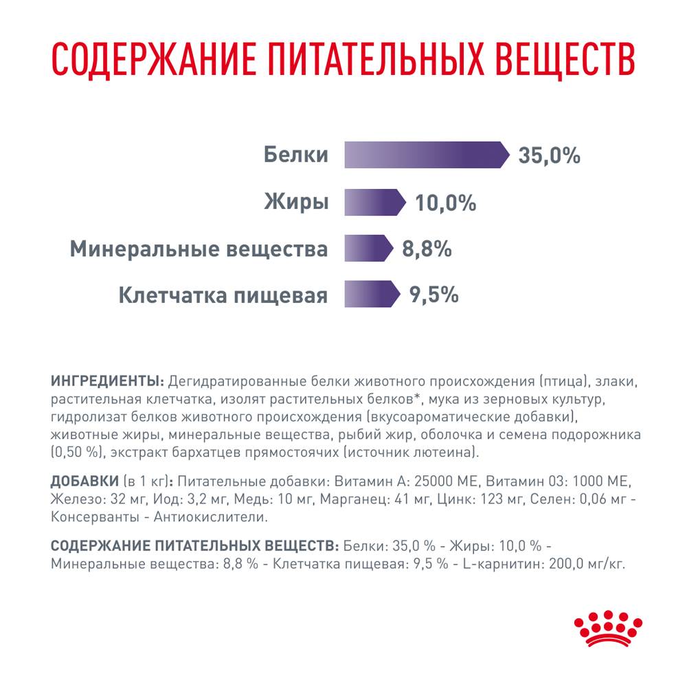 - ПОДДЕРЖАНИЕ ОПТИМАЛЬНОГО ВЕСА. Умеренное содержание жира и калорий помогает кошкам поддерживать оптимальный вес. Адаптированное содержание белка помогает поддерживать мышечную массу.