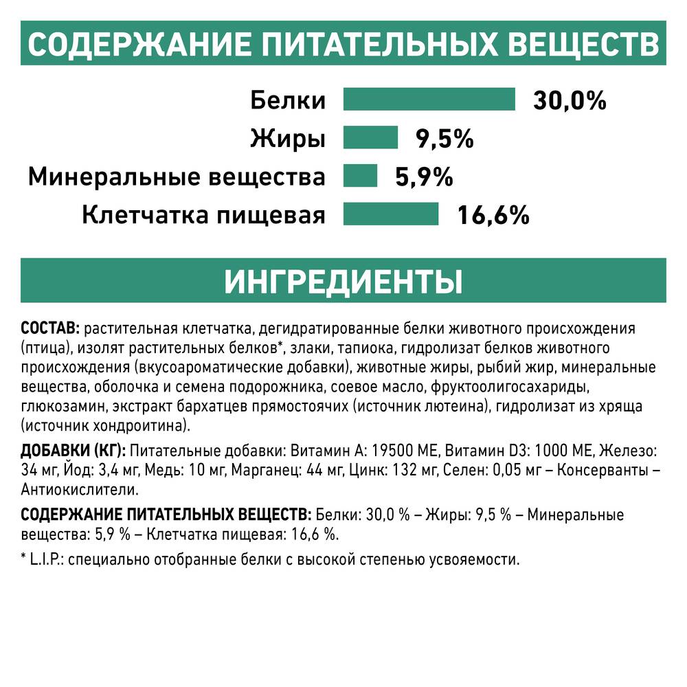 растительная клетчатка, дегидратированное мясо птицы, пшеничная клейковина**, тапиока, кукурузная клейковина, гидролизат животных белков, кукуруза, пшеница, животные жиры, свекольный жом, рыбий жир, минеральные вещества, фруктоолигосахариды, соевое масло, оболочки и семена подорожника, гидролизат из панциря ракообразных (источник глюкозамина), экстракт бархатцев прямостоячих (источник лютеина), гидролизат из хряща (источник хондроитина).