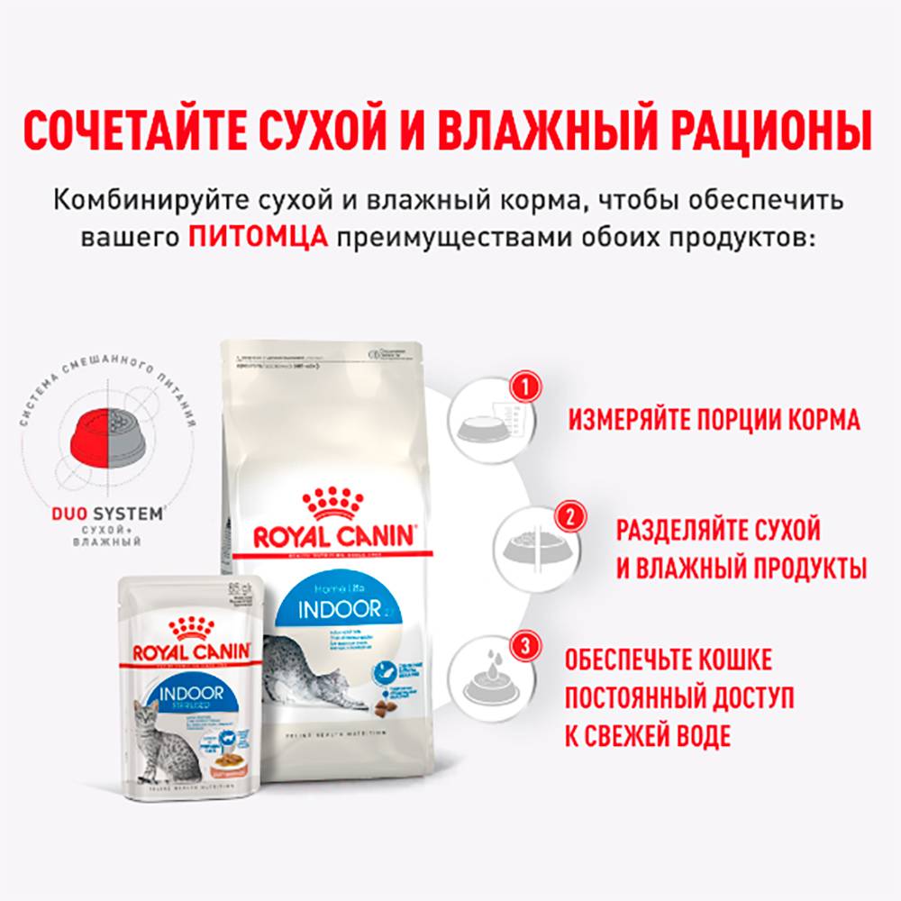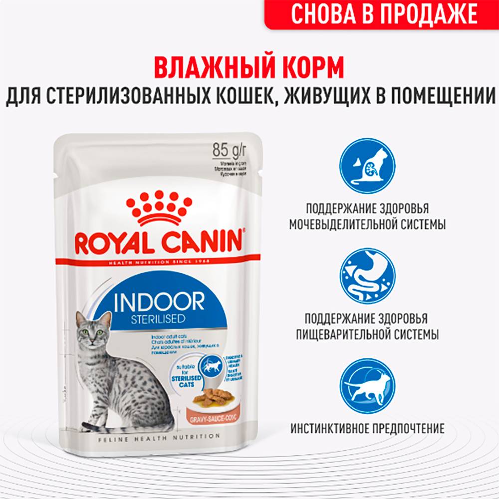 Индор Стерилайзд: корм консервированный полнорационный для взрослых кошек (в возрасте от 1 года до 7 лет), постоянно живущих в помещении. Взрослые кошки, постоянно содержащиеся в помещении, менее активны по сравнению с животными, имеющими доступ на улицу. Вот почему для их здоровья так важен полноценный сбалансированный рацион, богатый ценными питательными веществами. Влажный Корм Indoor Sterilised в соусе содержит белки с высокой усвояемостью, оптимальный процент клетчатки и специальный комплекс нутриентов, стимулирующие пищеварение. Корм обладает балансом минеральных веществ, помогающим поддерживать здоровье мочевыделительной системы взрослой кошки. Основные источники энергии корма (белки, жиры и углеводы) находятся в продукте в такой пропорции, которая на инстинктивном уровне предпочитается большинством взрослых кошек. Низкая калорийность помогает поддерживать оптимальный вес малоактивной домашней кошки.