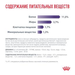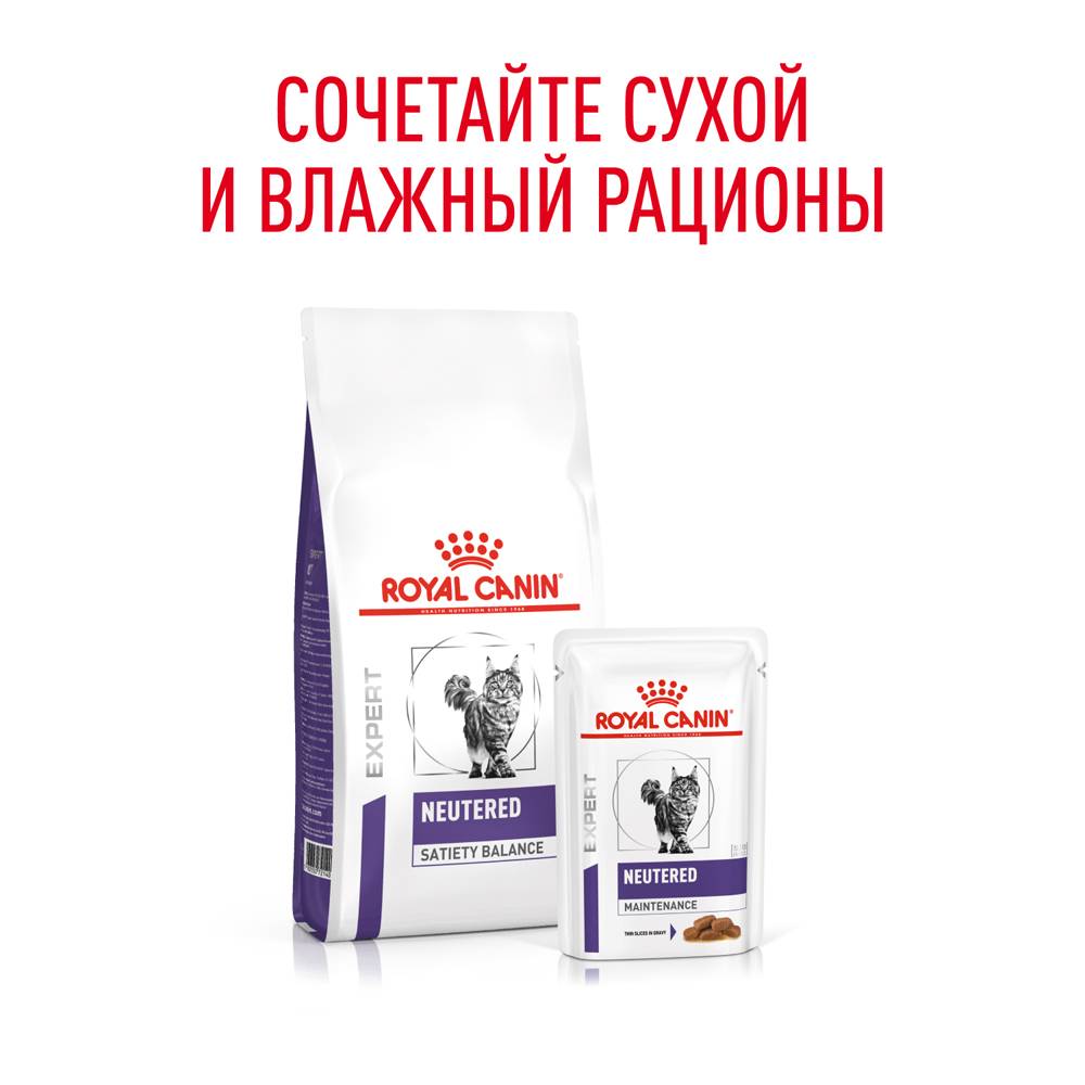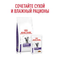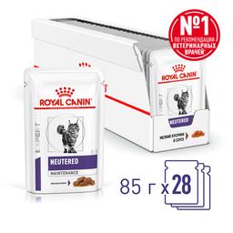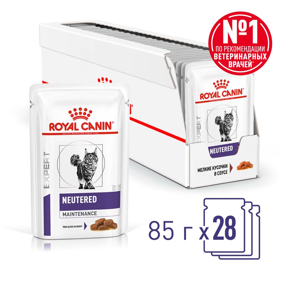 Корм консервированный полнорационный ROYAL CANIN NEUTERED MAINTENANCE (НЬЮТРИД МЕЙНТАНЕНС), мелкие кусочки в соусе, для стерилизованных/кастрированных взрослых кошек с момента стерилизации и кастрации до 7 лет. Помогает поддерживать оптимальный вес у кастрированных/стерилизованных кошек за счет умеренного содержания жиров и энергии, а также поддерживает мышечную массу за счет высокого содержания белка.