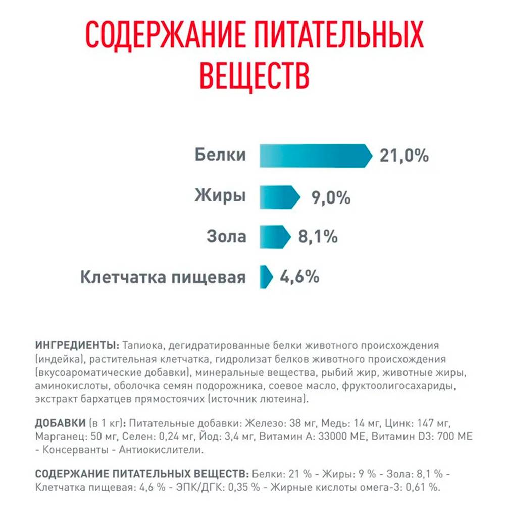 - Ненасыщенные жирные кислоты для поддержания здоровья кожи и пищеварения. Корм способствует сохранению естественного защитного барьера кожи