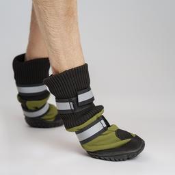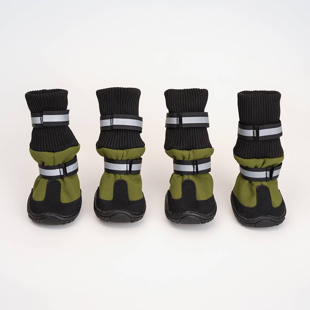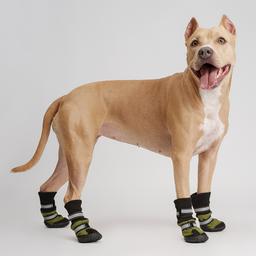 - Удобные застежки-липучки надежно фиксирует обувь на лапах.