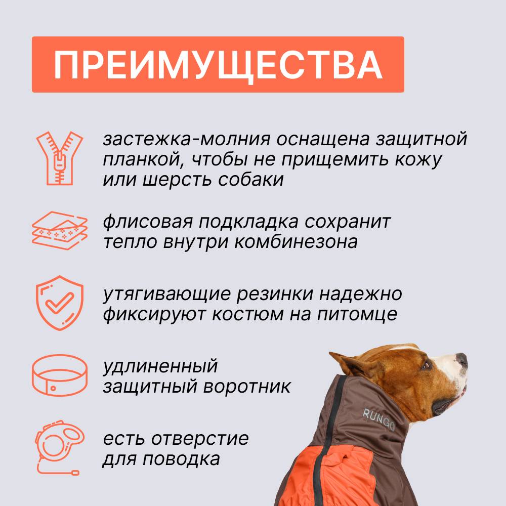 Теплый комбинезон от бренда RUNGO – эффективный способ сделать прогулку с питомцем комфортной в любую непогоду. Одежда защитит Вашего четвероногого друга от сырости, загрязнений и переохлаждения.
