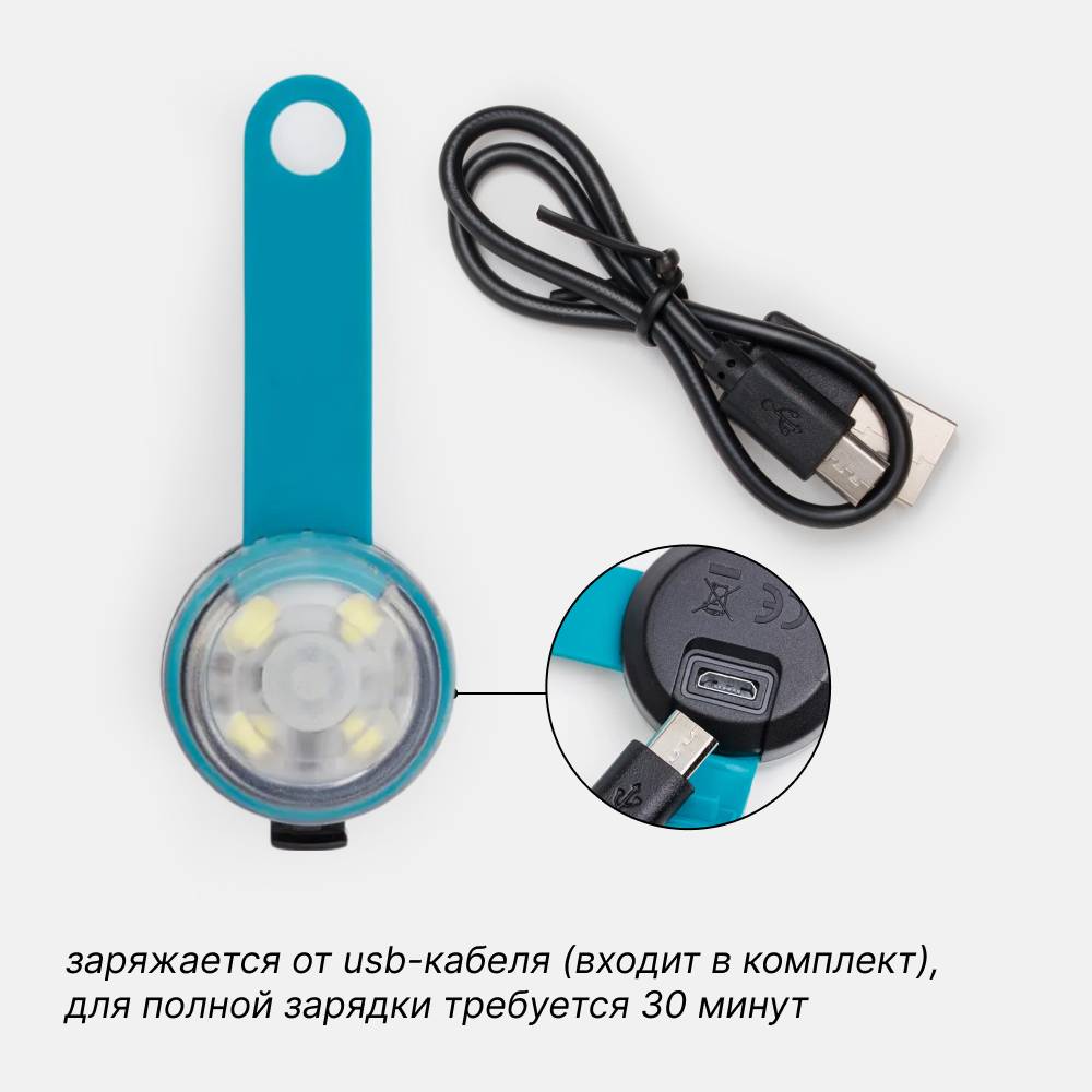 - Заряжается от USB провода (входит в комплект). 1 зарядки хватает до 5 часов работы в мигающем режиме и до 2,5 часов в режиме постоянного свечения. 30 минут до полной зарядки.
