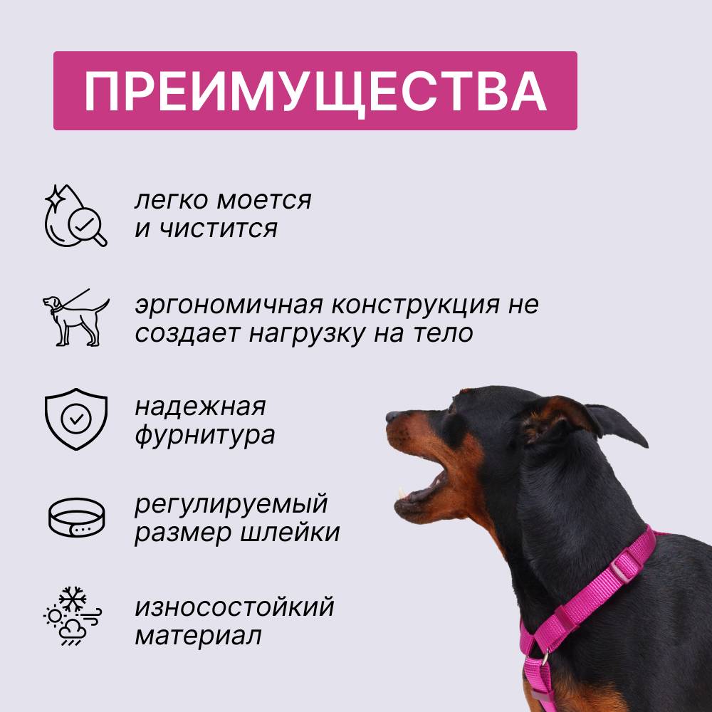 - При натяжении поводка шлейка не съезжает на шею собаки благодаря креплению в зоне спины.