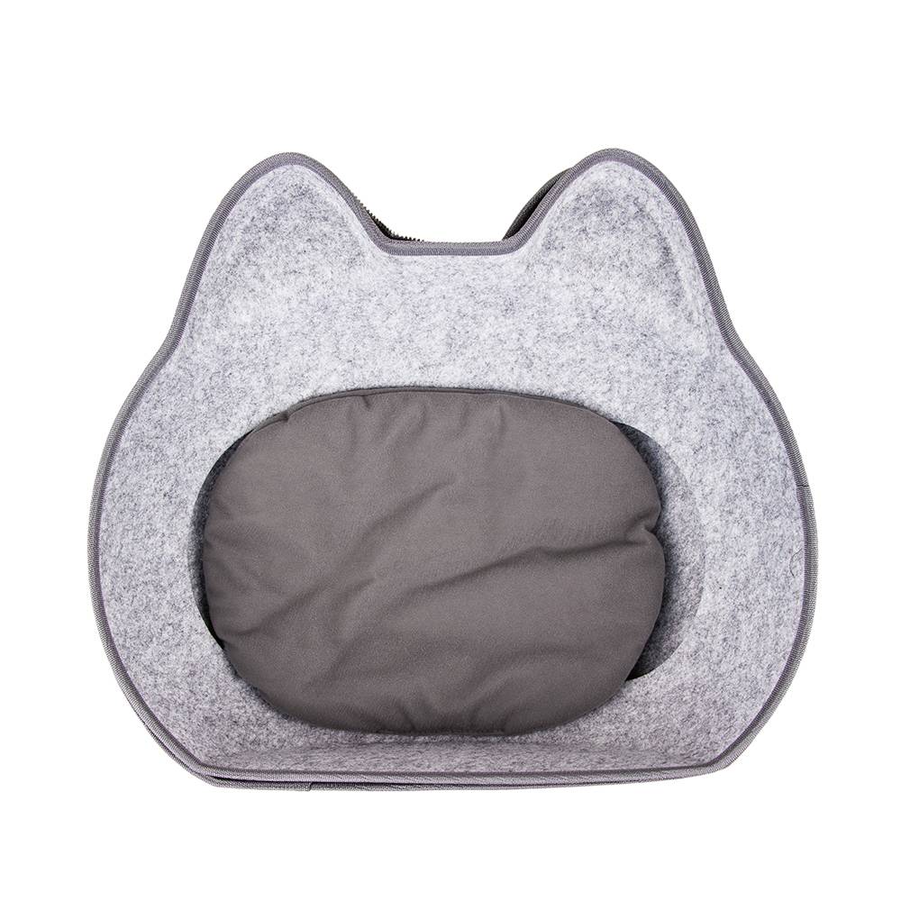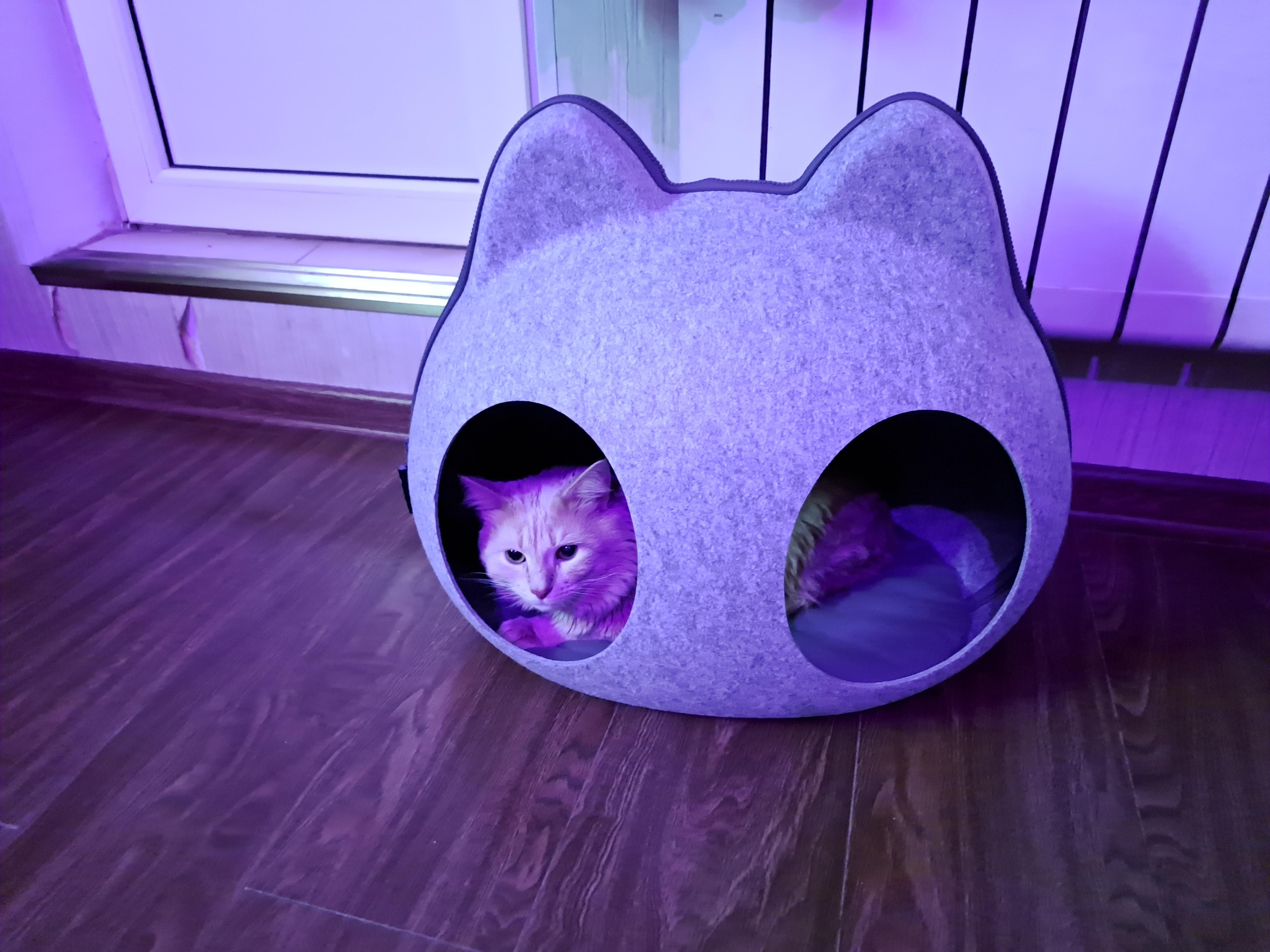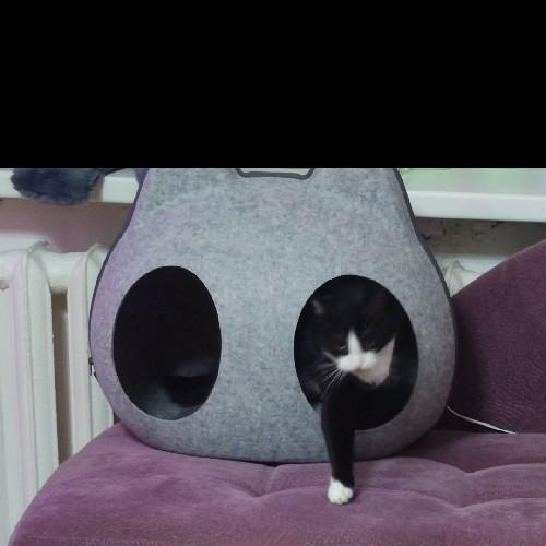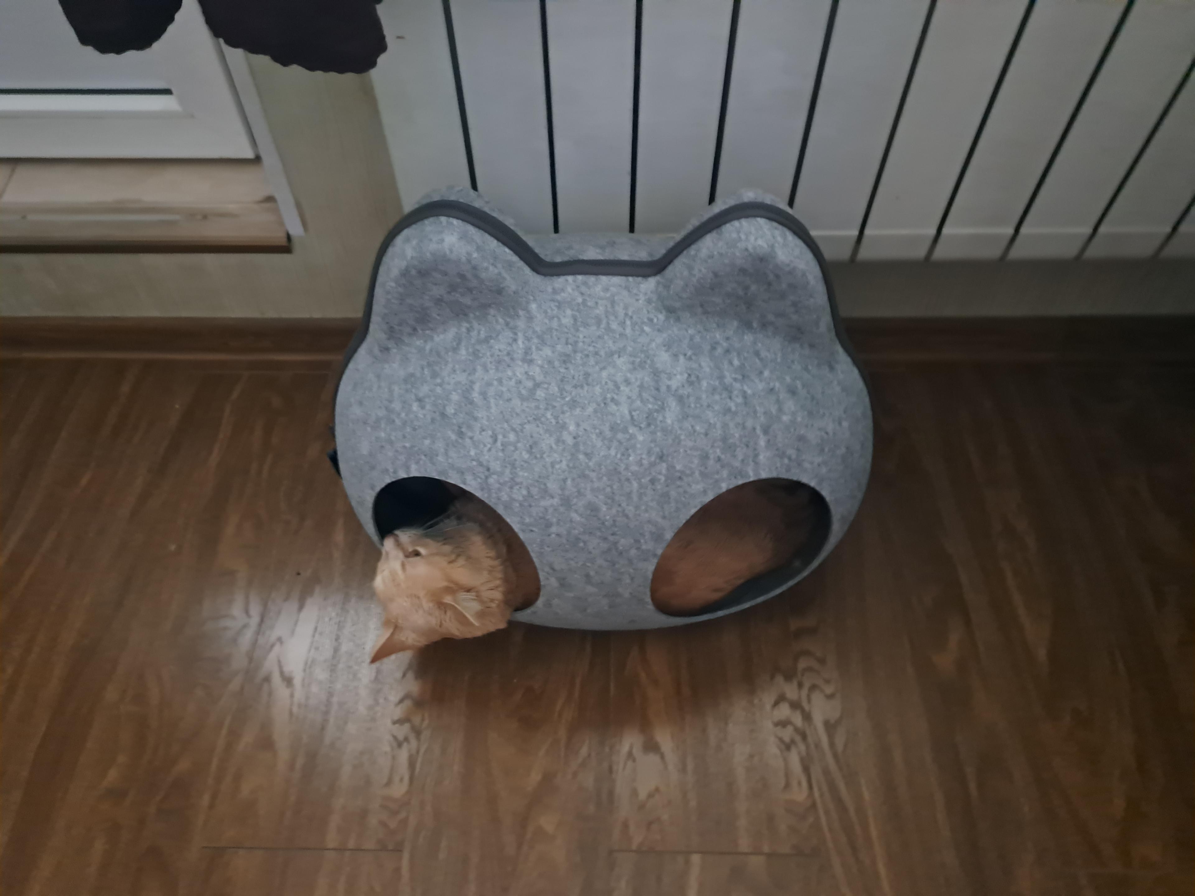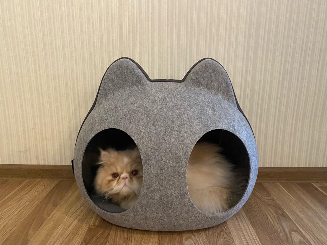 - Домик состоит из двух частей, верх и низ. Верх отстегивается на молнии и имеет два отверстия (входа) на крыше, через которые будет заходить питомец, когда домик закрыт на молнию.