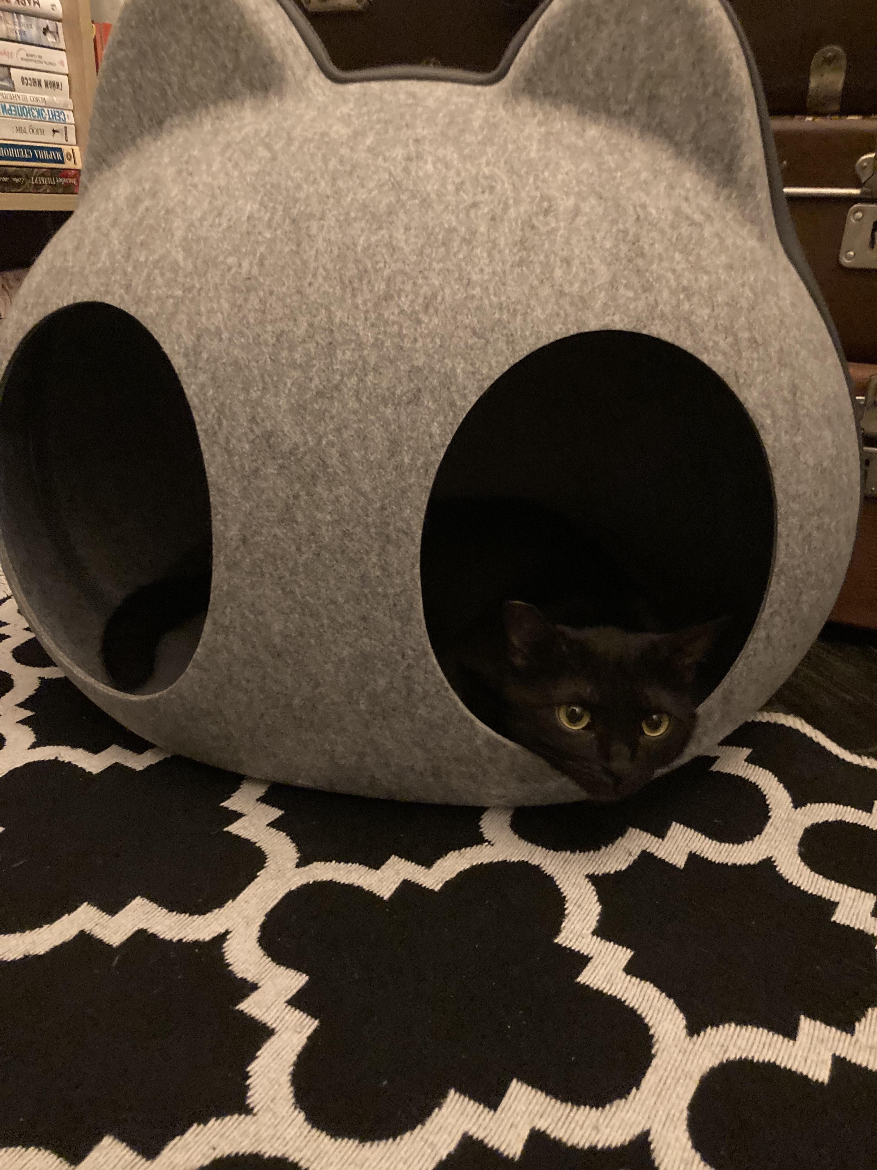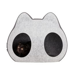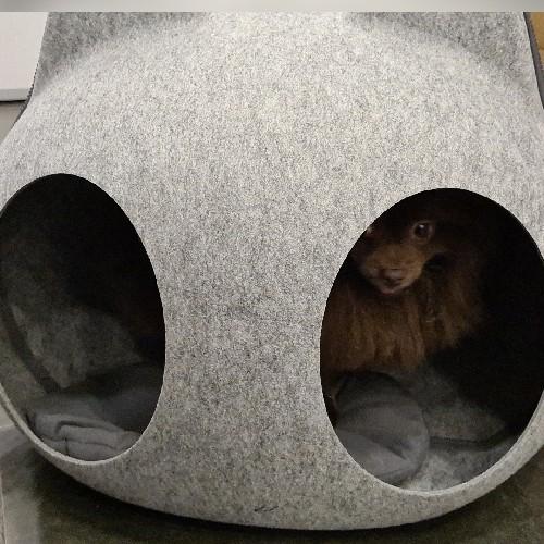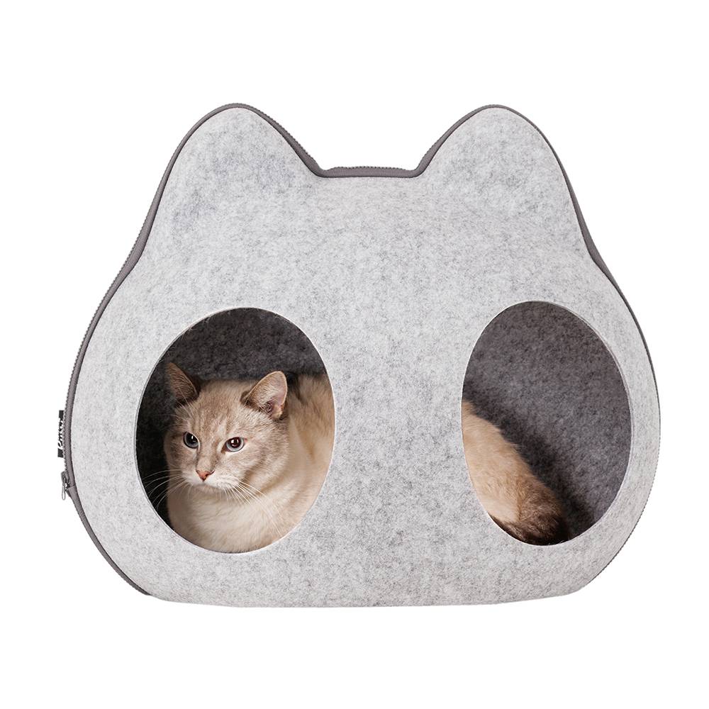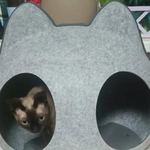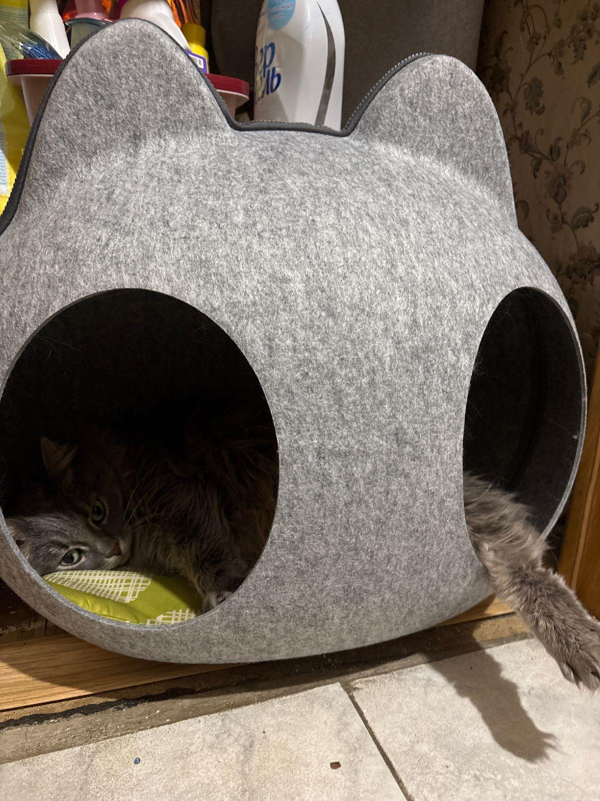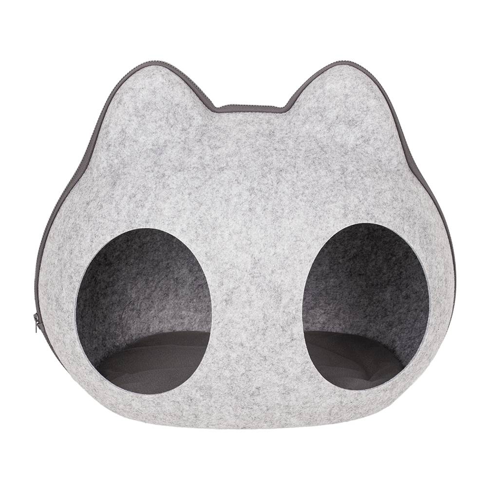 - Домик состоит из двух частей, верх и низ. Верх отстегивается на молнии и имеет два отверстия (входа) на крыше, через которые будет заходить питомец, когда домик закрыт на молнию.
