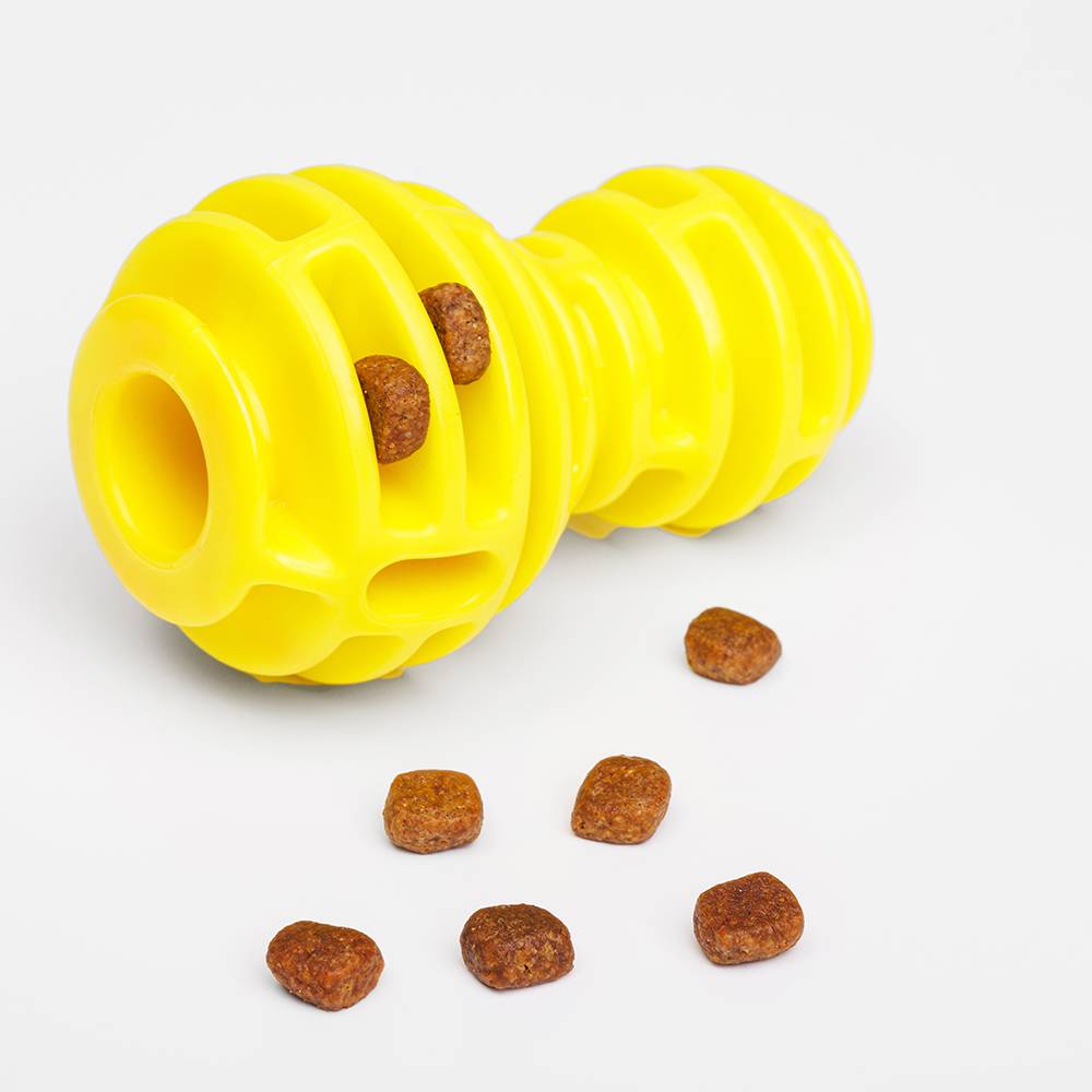 - Гантель – излюбленная игрушка многих собак, её можно грызть, использовать во время прогулок на улице для совместных активных игр, а также для тренировок.