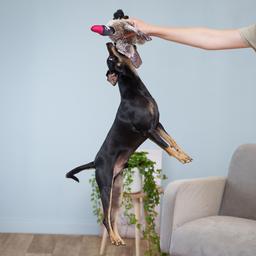 - Игрушка не только приносит радость от игры, но также способствует тренировке жевательных мышц у собаки и массажу дёсен.