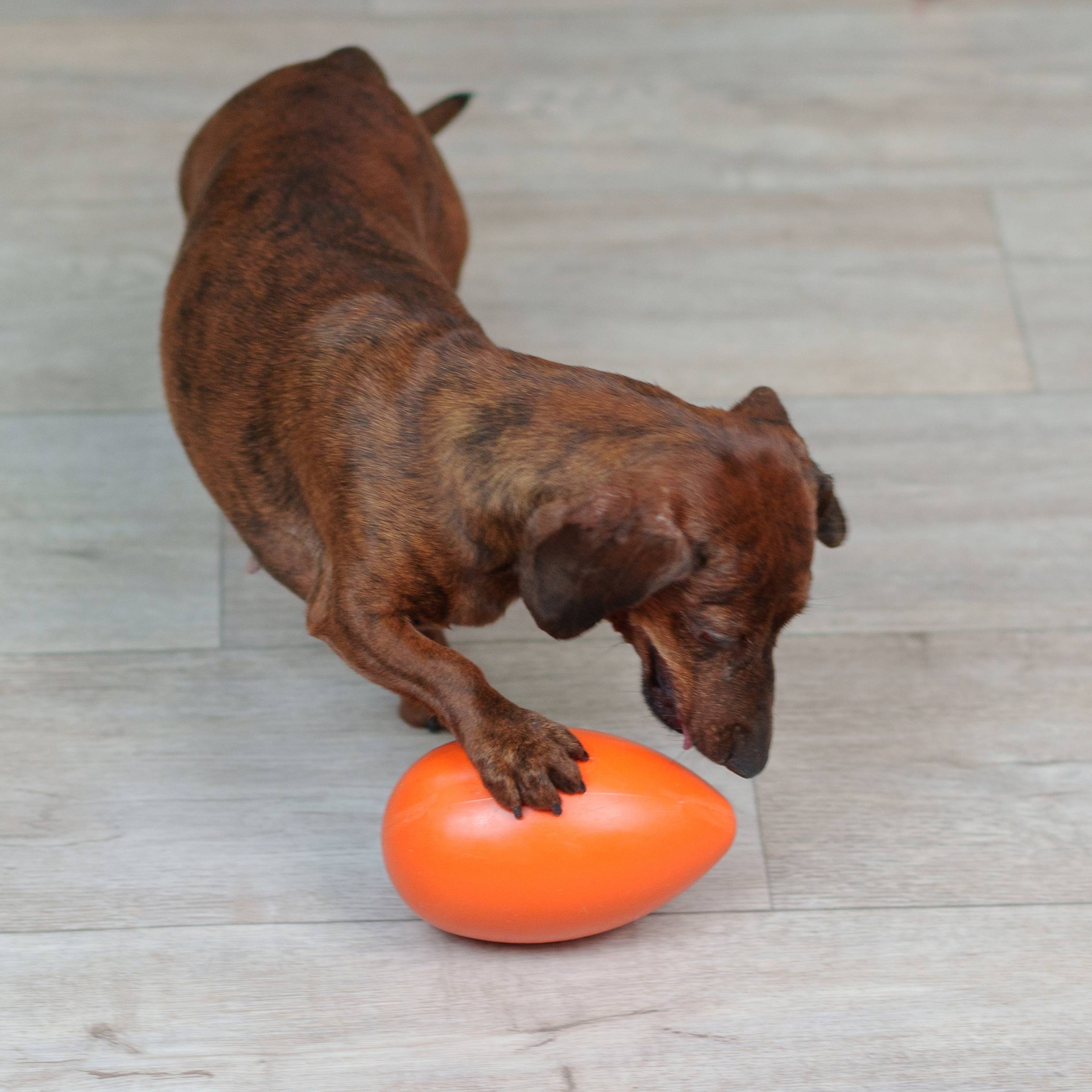 - Собака пытается взять игрушку в пасть, но не получается – яйцо ускользает, побуждая питомца предпринимать новые и новые попытки.