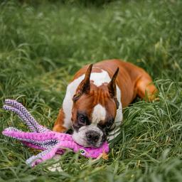 - У питомца не должно быть возможности проглотить изделие целиком или какие-либо его части. Если собака склонна к поеданию несъедобных предметов, давайте игрушку под присмотром.