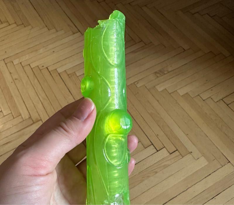 Приятна на ощупь, грызть, думаю, тоже приятно) поверхность неровная, с углублениями и выступами, что понравилось щенку- удобно чесать зубки. При сильном сжатии издает негромкие звуки-поскрипывания, тоже нравится.