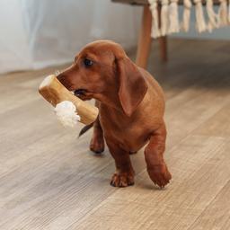 Подбирайте игрушку согласно размерам питомца. У собаки не должно быть возможности проглотить изделие целиком или какие-либо его части. Если любимец склонен к поеданию несъедобных предметов, давайте игрушку под присмотром.