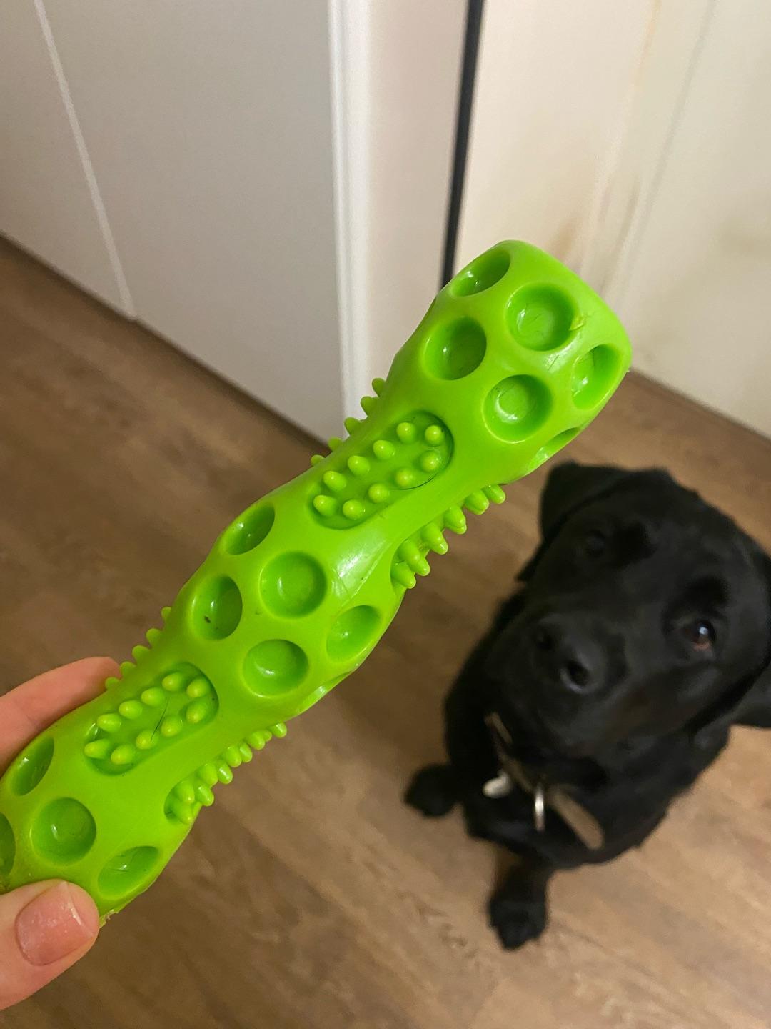 Отличная игрушка, очень прочная. Лабрадор прекрасно с ней играет, можно кидать как палку, играть в перетягивание. Очень функциональная. Собака просто в восторге.Комментарий