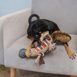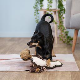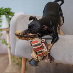 Великолепная игрушка, качественно прошита, прочный материал. Сделана из разных материалов, что создаёт тактильное разнообразие. Собака очень любит эту игрушку, а саму игрушку пока не сломили режущиеся зубы и вандальные игры.
